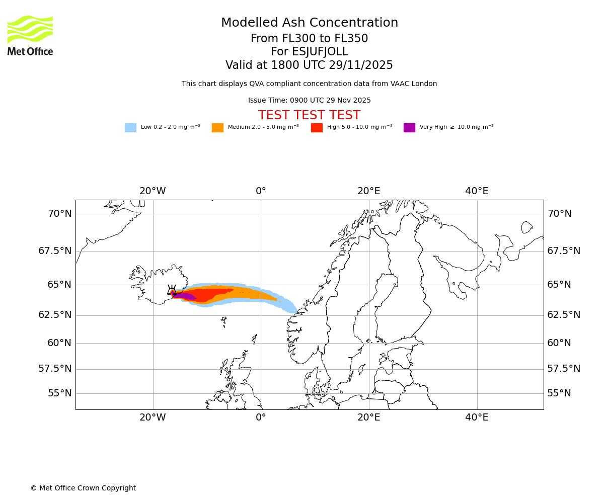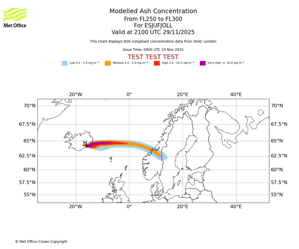 Modelled ash concentration from 250 to 300 for ESJUFJOLL. Valid at 1800 UTC 29/11/2025