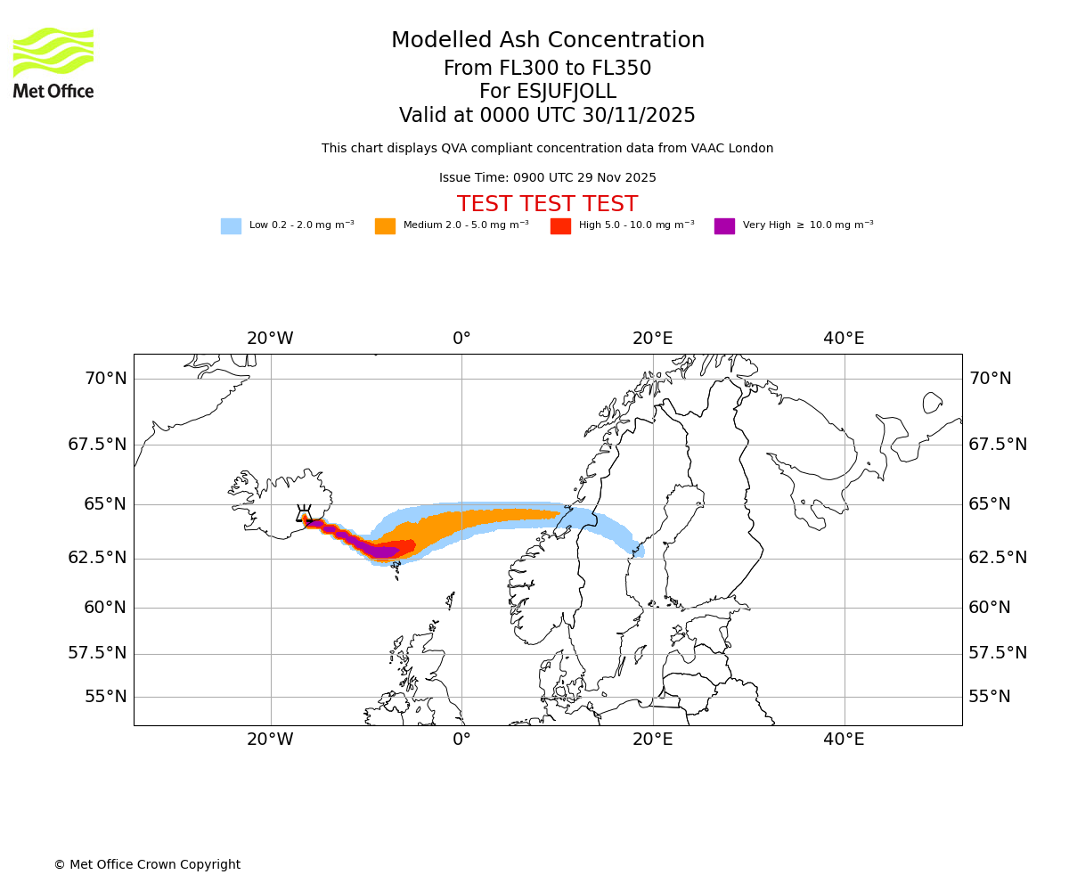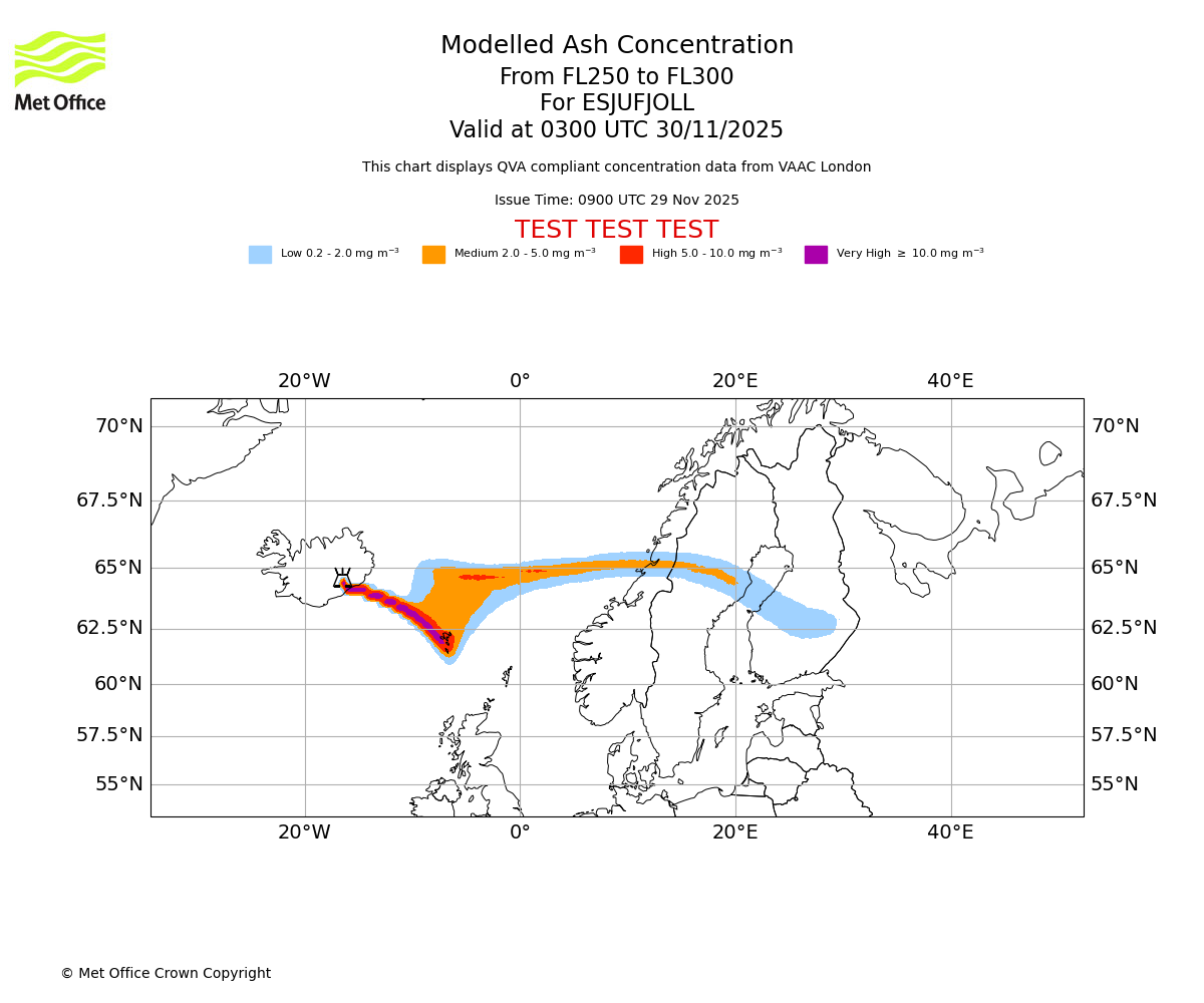 Modelled ash concentration from 250 to 300 for ESJUFJOLL. Valid at 0000 UTC 30/11/2025