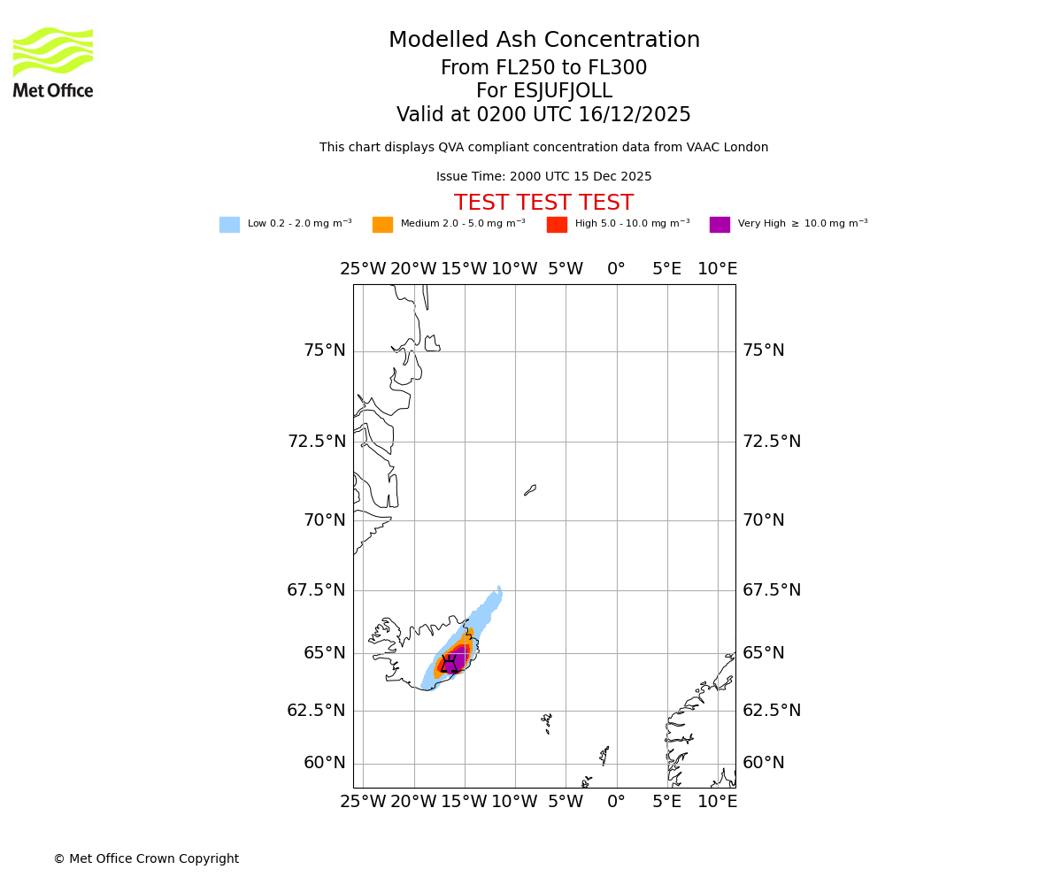 Modelled ash concentration from 250 to 300 for ESJUFJOLL. Valid at 2300 UTC 15/12/2025