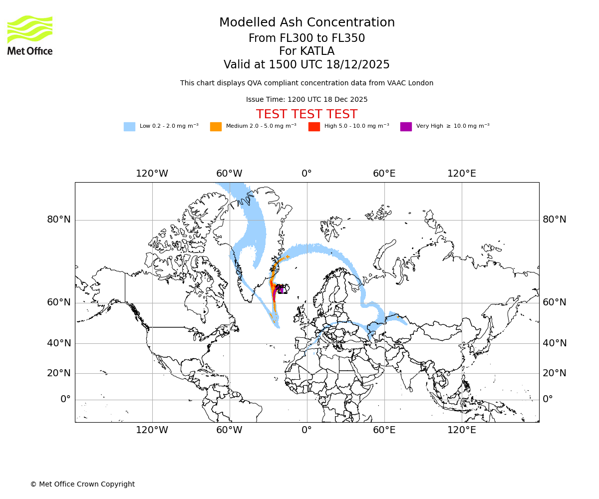 Modelled ash concentration from 250 to 300 for KATLA. Valid at 1500 UTC 18/12/2025
