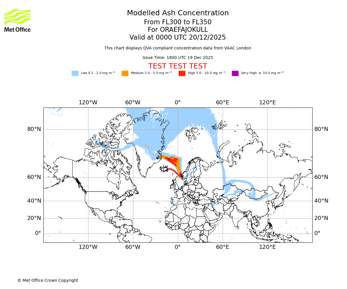 Modelled ash concentration from 250 to 300 for ORAEFAJOKULL. Valid at 0000 UTC 20/12/2025