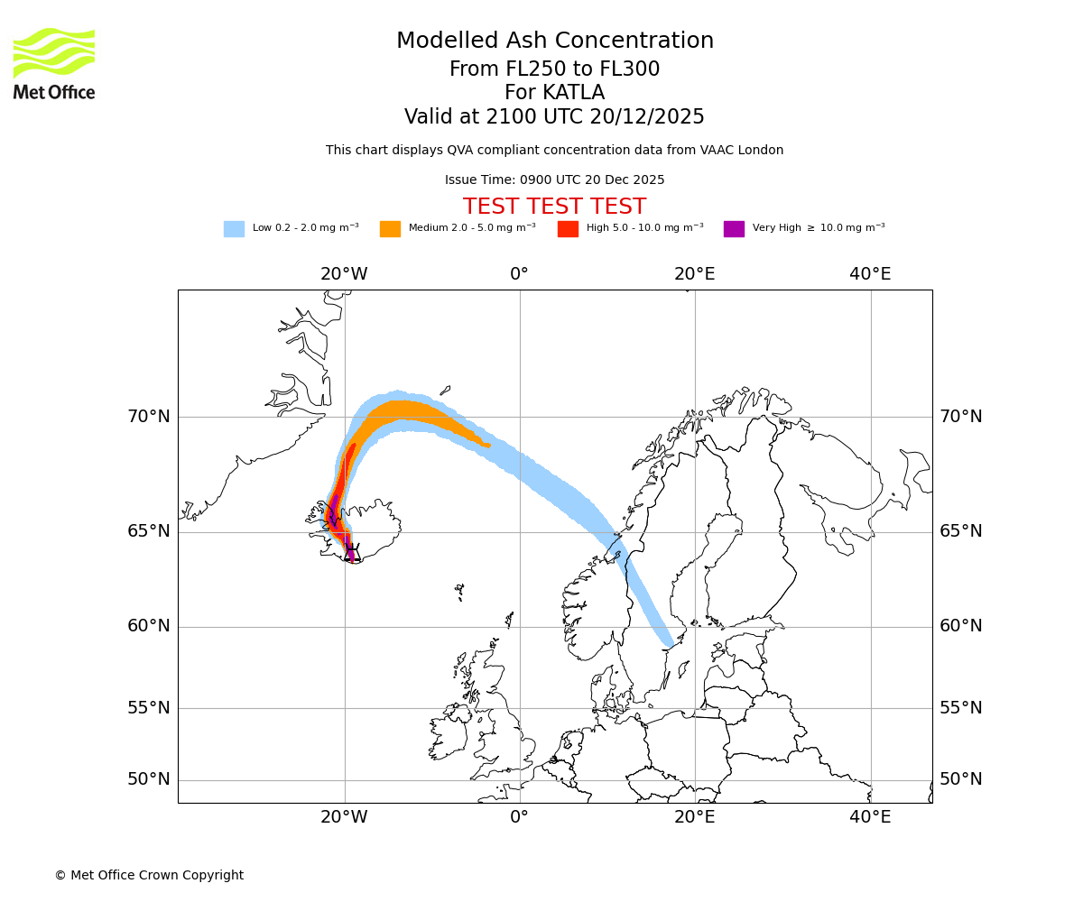 Modelled ash concentration from 250 to 300 for KATLA. Valid at 1800 UTC 20/12/2025