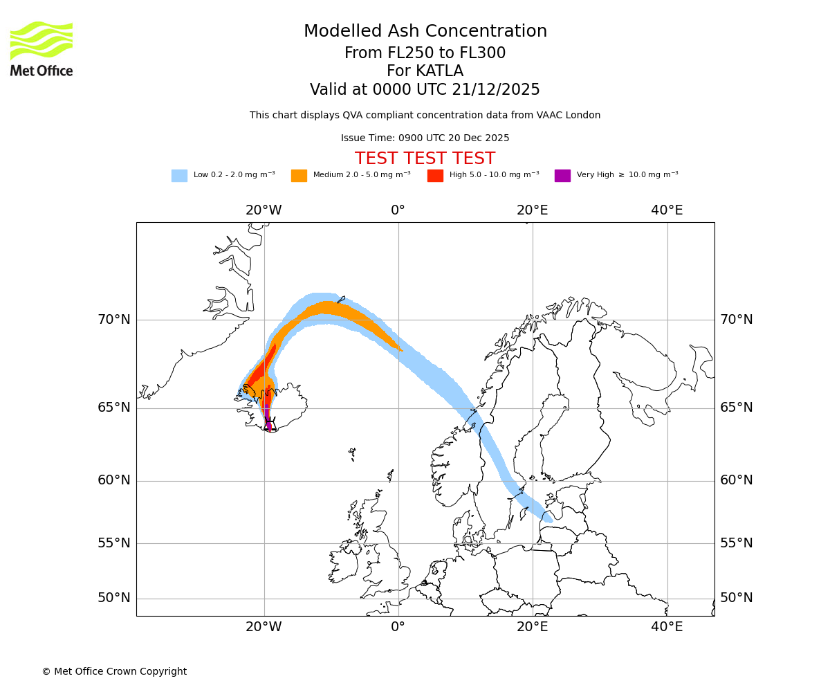 Modelled ash concentration from 250 to 300 for KATLA. Valid at 2100 UTC 20/12/2025