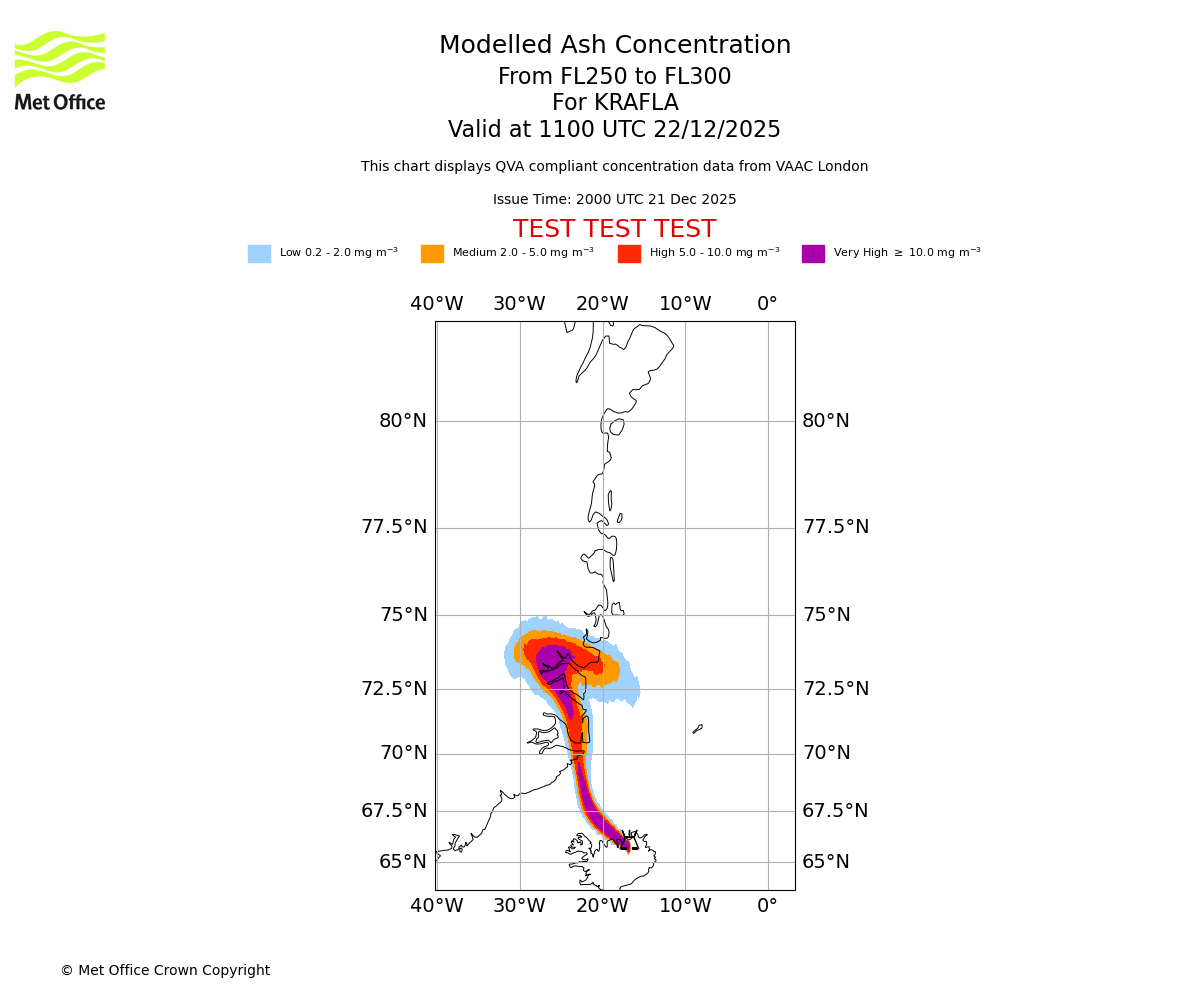 Modelled ash concentration from 250 to 300 for KRAFLA. Valid at 0800 UTC 22/12/2025