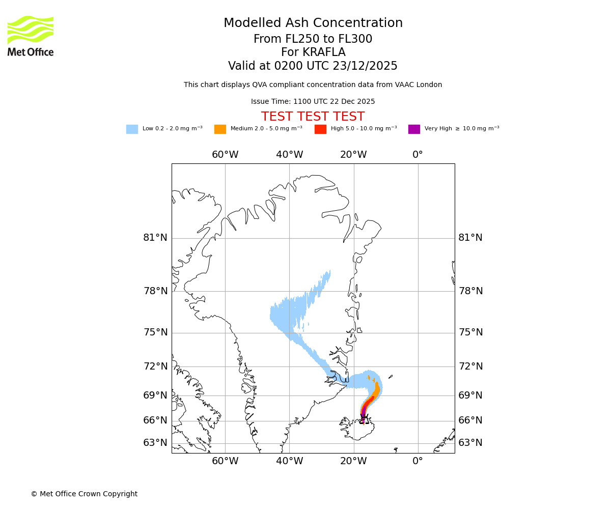 Modelled ash concentration from 250 to 300 for KRAFLA. Valid at 2300 UTC 22/12/2025