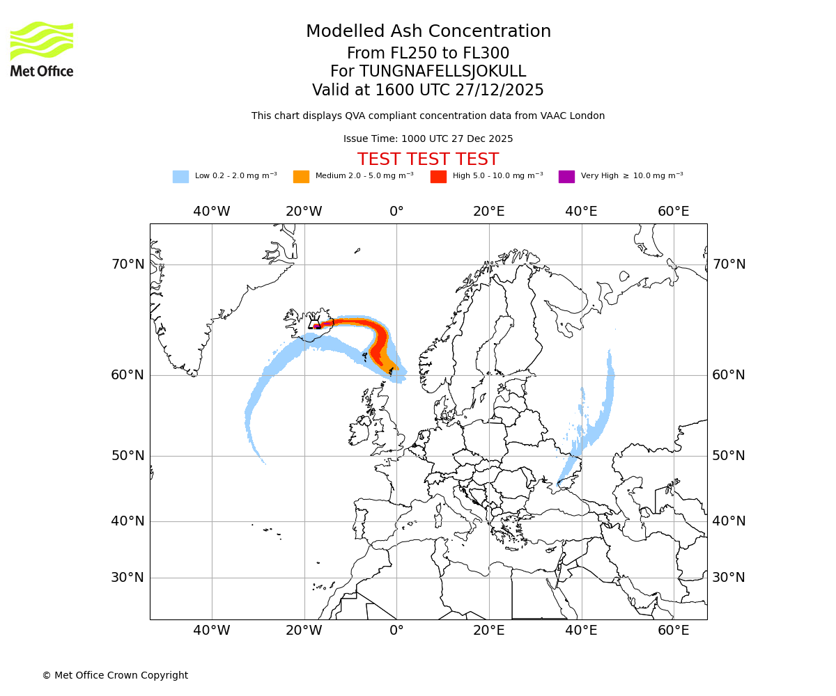 Modelled ash concentration from 250 to 300 for TUNGNAFELLSJOKULL. Valid at 1300 UTC 27/12/2025