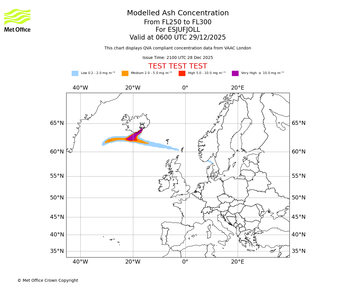 Modelled ash concentration from 250 to 300 for ESJUFJOLL. Valid at 0300 UTC 29/12/2025