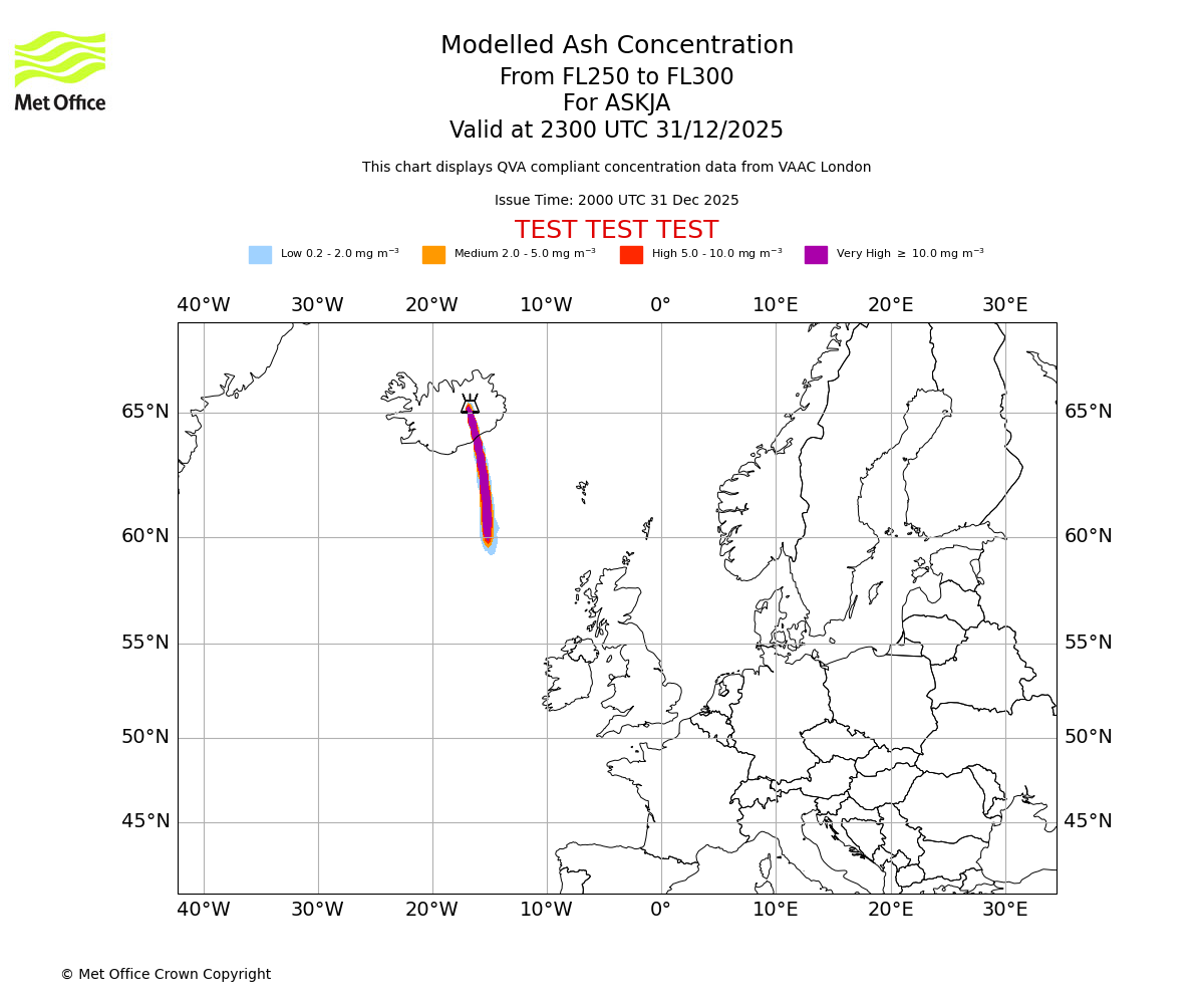 Modelled ash concentration from 250 to 300 for ASKJA. Valid at 2000 UTC 31/12/2025