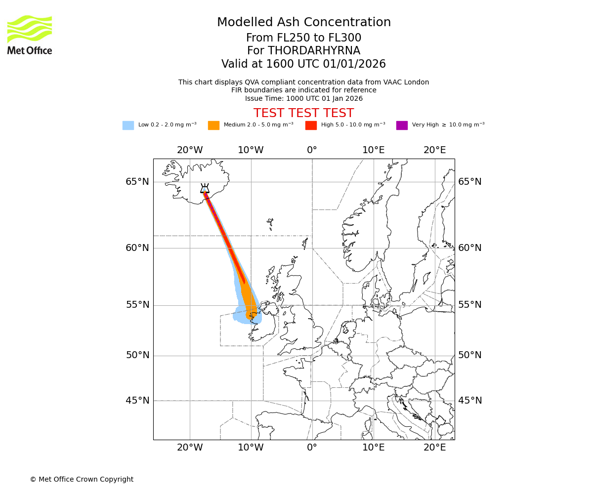 Modelled ash concentration from 250 to 300 for THORDARHYRNA. Valid at 1300 UTC 01/01/2026