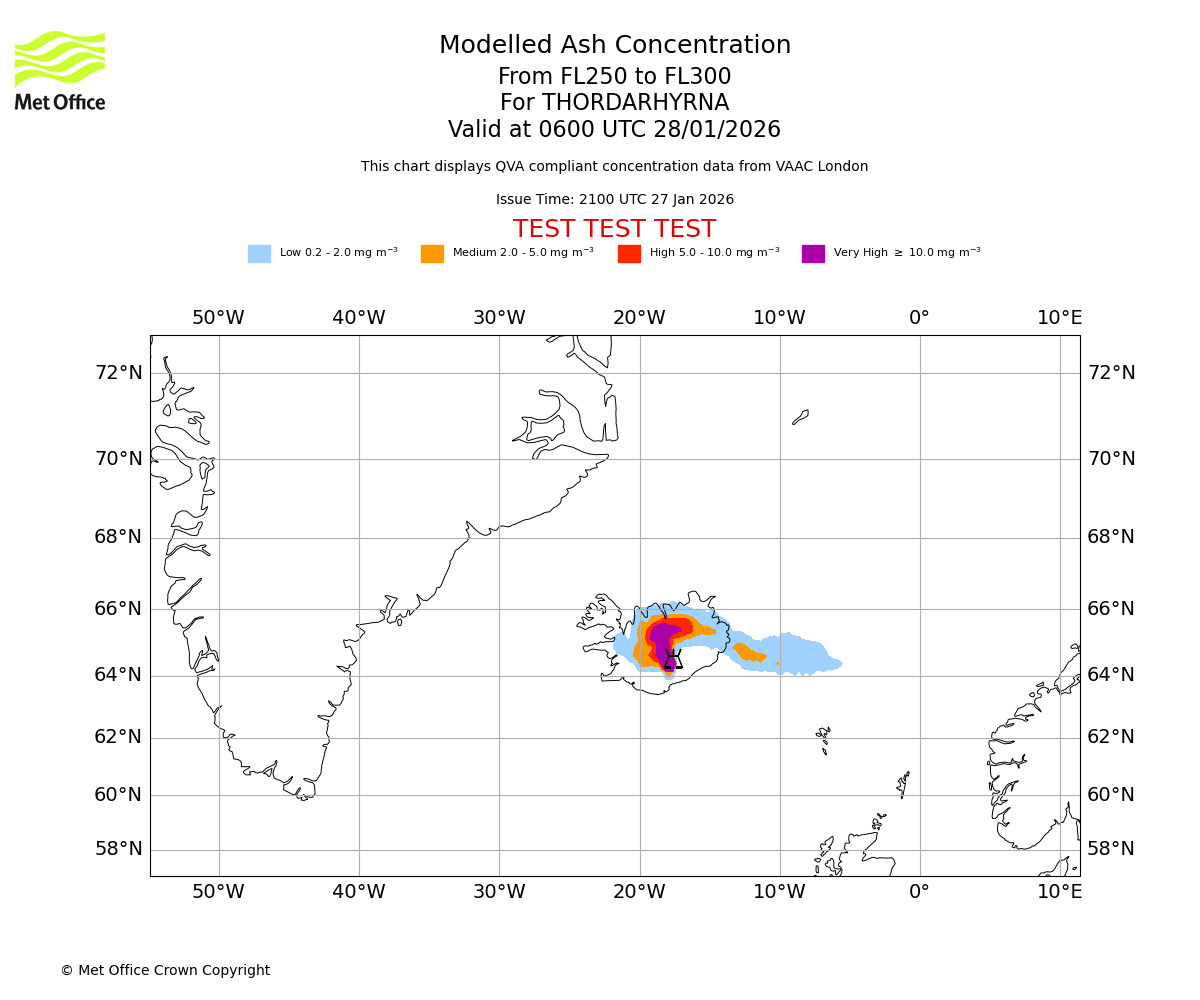 Modelled ash concentration from 250 to 300 for THORDARHYRNA. Valid at 0300 UTC 28/01/2026