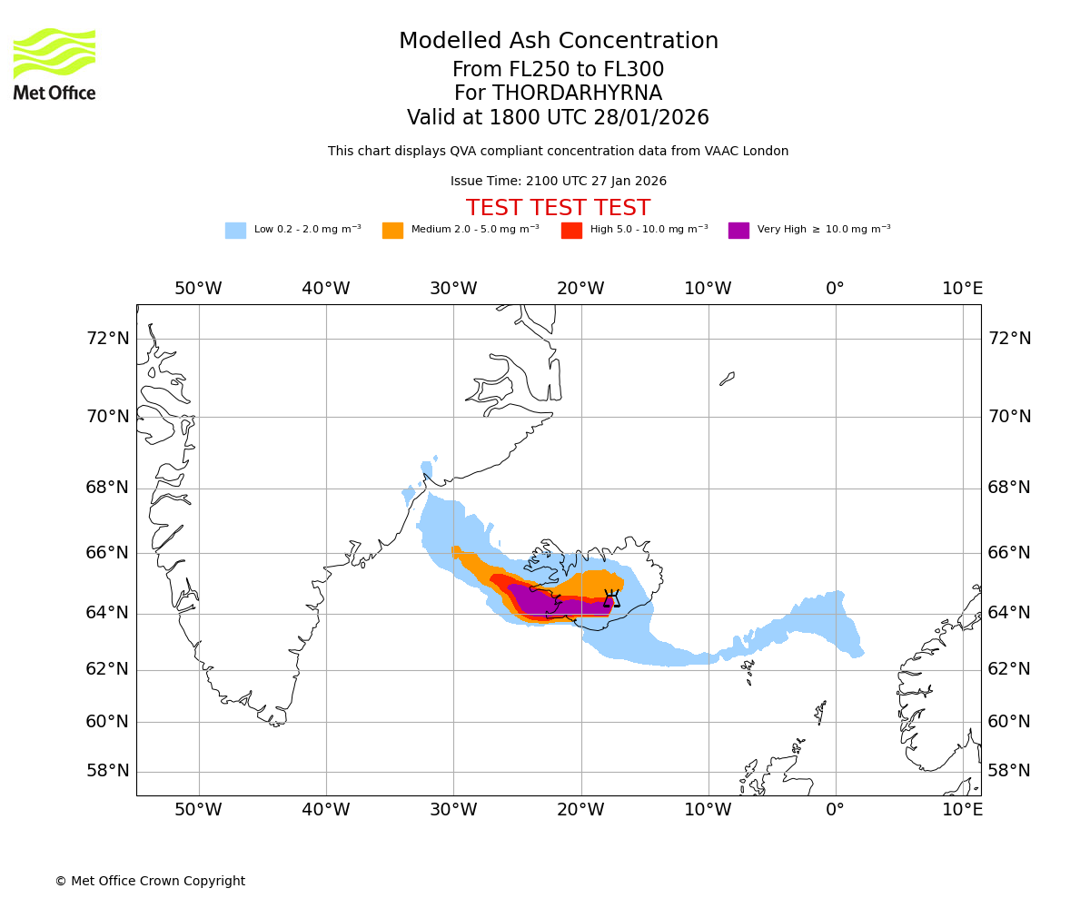 Modelled ash concentration from 250 to 300 for THORDARHYRNA. Valid at 1500 UTC 28/01/2026