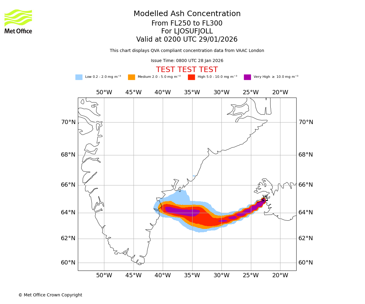 Modelled ash concentration from 250 to 300 for LJOSUFJOLL. Valid at 2300 UTC 28/01/2026