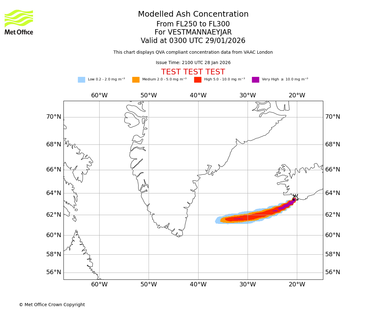 Modelled ash concentration from 250 to 300 for VESTMANNAEYJAR. Valid at 0000 UTC 29/01/2026