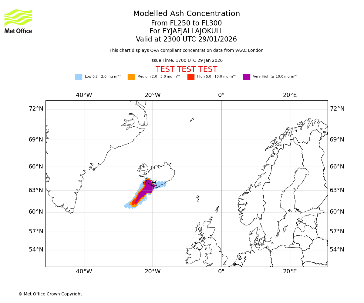 Modelled ash concentration from 250 to 300 for EYJAFJALLAJOKULL. Valid at 2000 UTC 29/01/2026