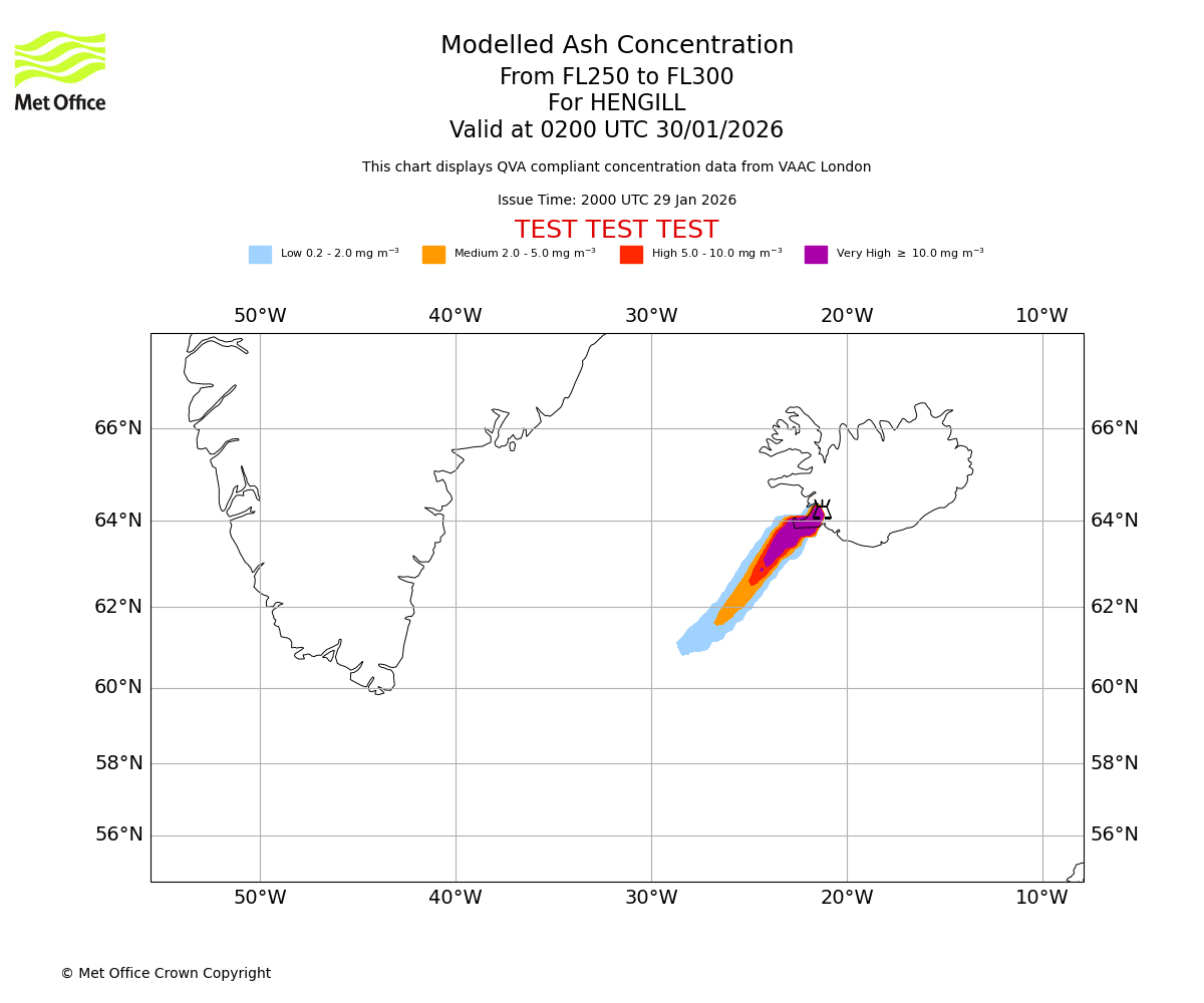 Modelled ash concentration from 000 to 200 for HENGILL. Valid at 2000 UTC 29/01/2026