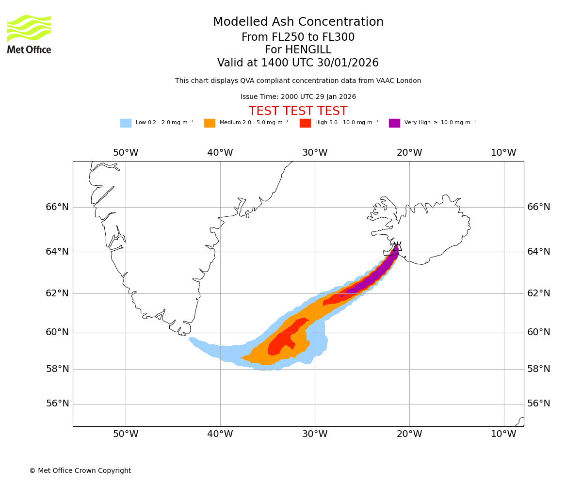 Modelled ash concentration from 250 to 300 for HENGILL. Valid at 1100 UTC 30/01/2026