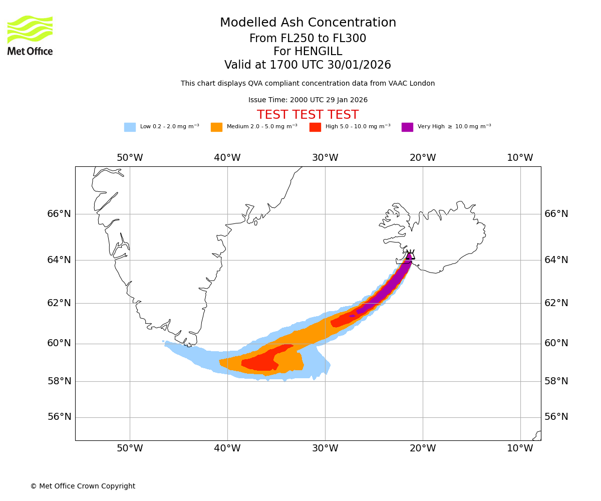 Modelled ash concentration from 250 to 300 for HENGILL. Valid at 1400 UTC 30/01/2026