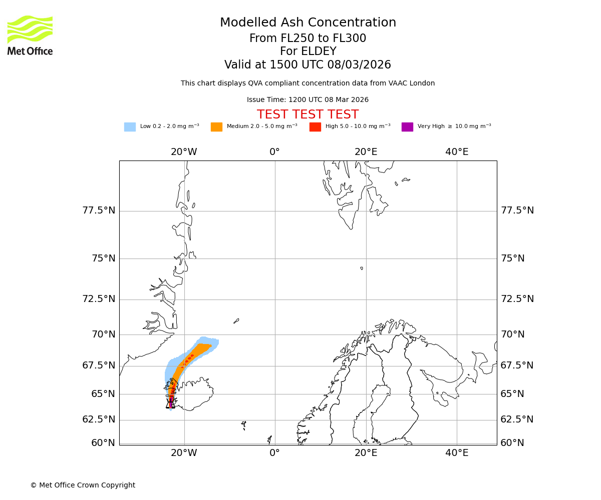 Modelled ash concentration from 250 to 300 for ELDEY. Valid at 1200 UTC 08/03/2026