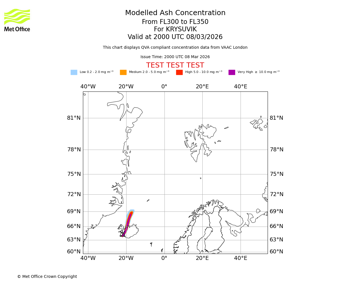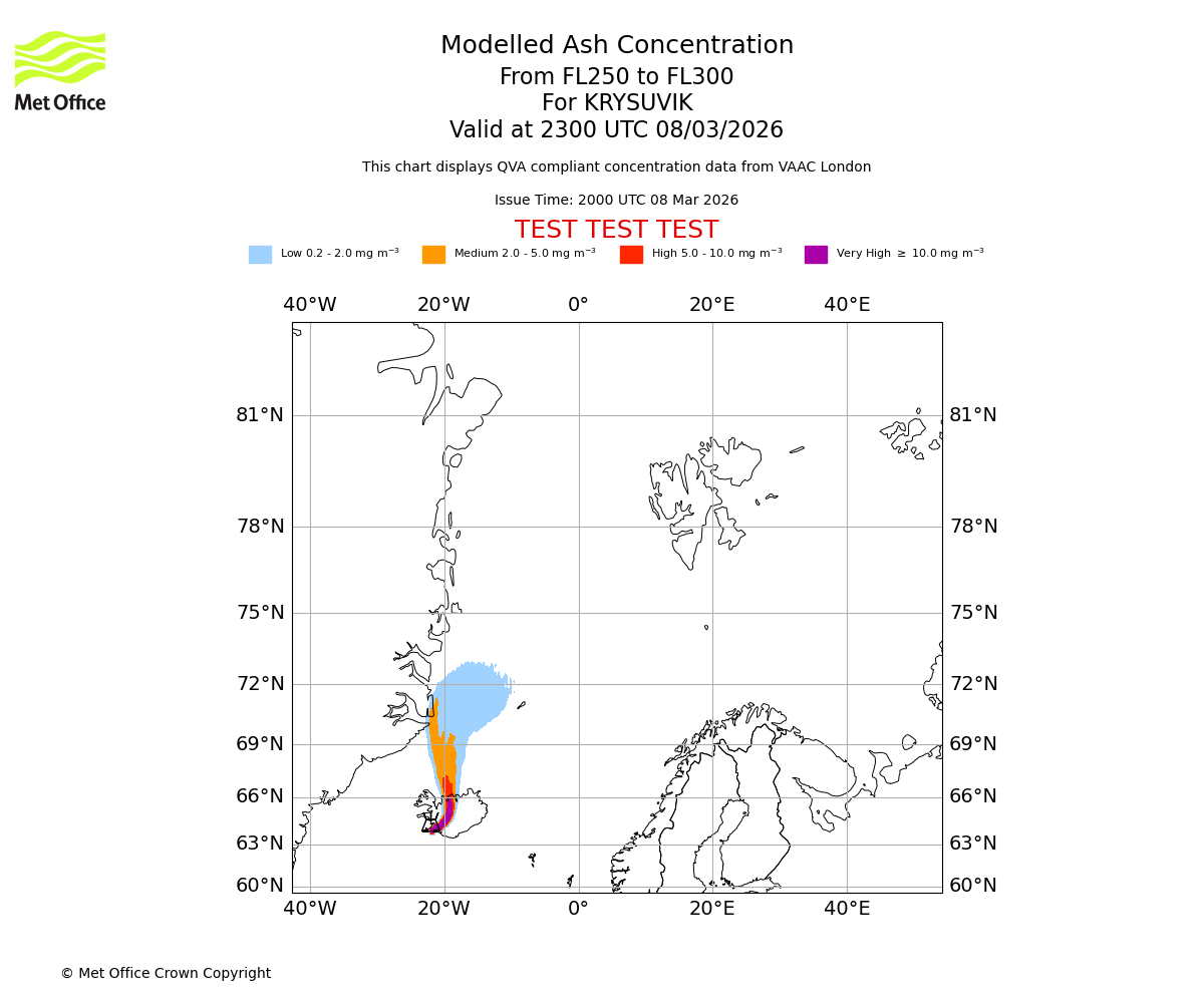 Modelled ash concentration from 250 to 300 for KRYSUVIK. Valid at 2000 UTC 08/03/2026