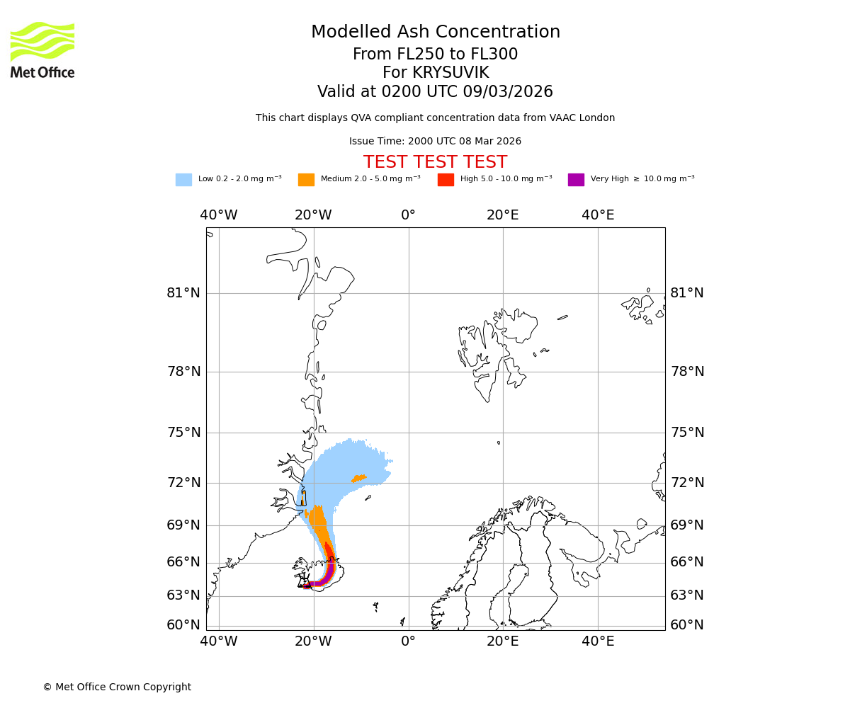 Modelled ash concentration from 250 to 300 for KRYSUVIK. Valid at 2300 UTC 08/03/2026
