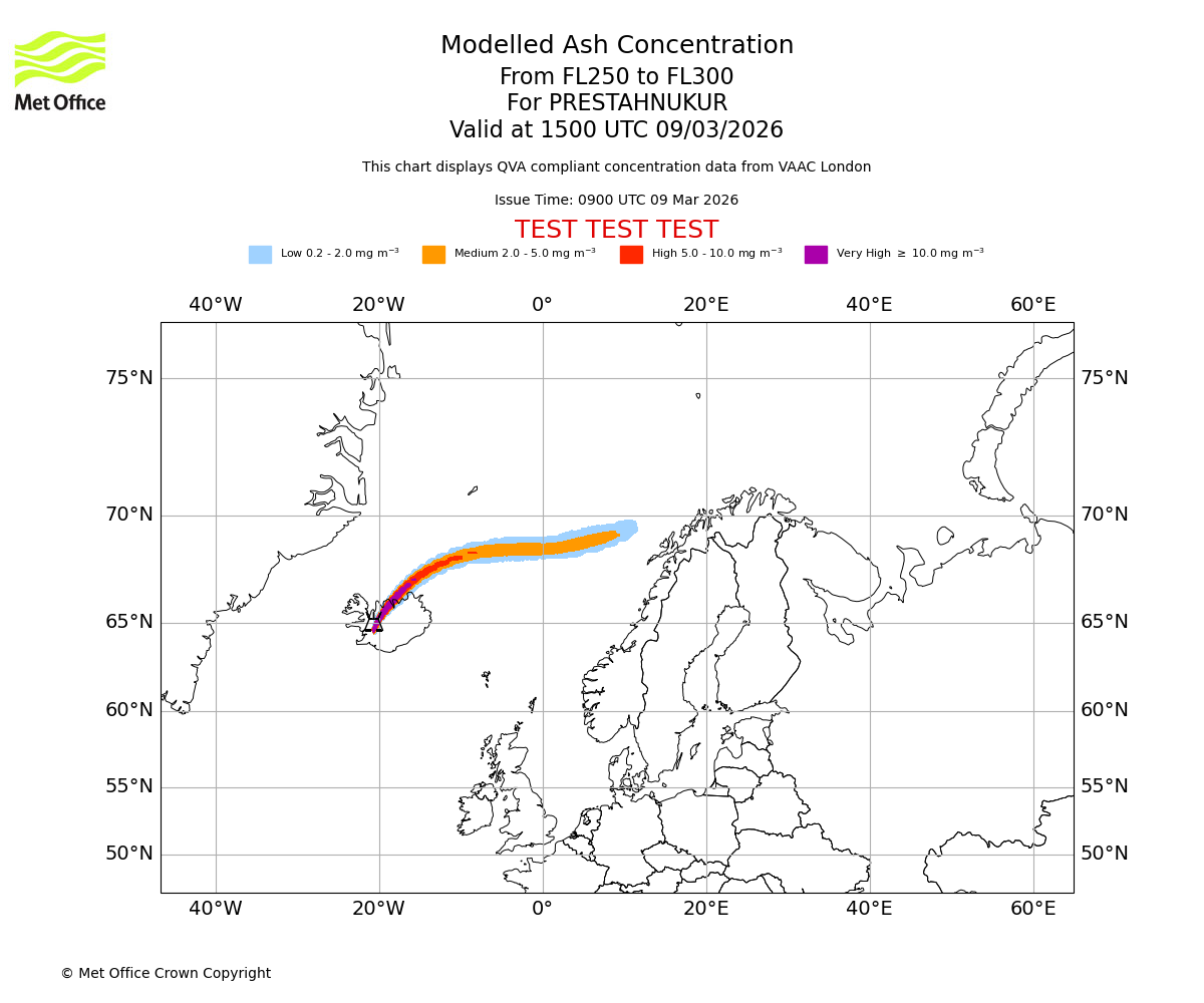 Modelled ash concentration from 250 to 300 for PRESTAHNUKUR. Valid at 1200 UTC 09/03/2026