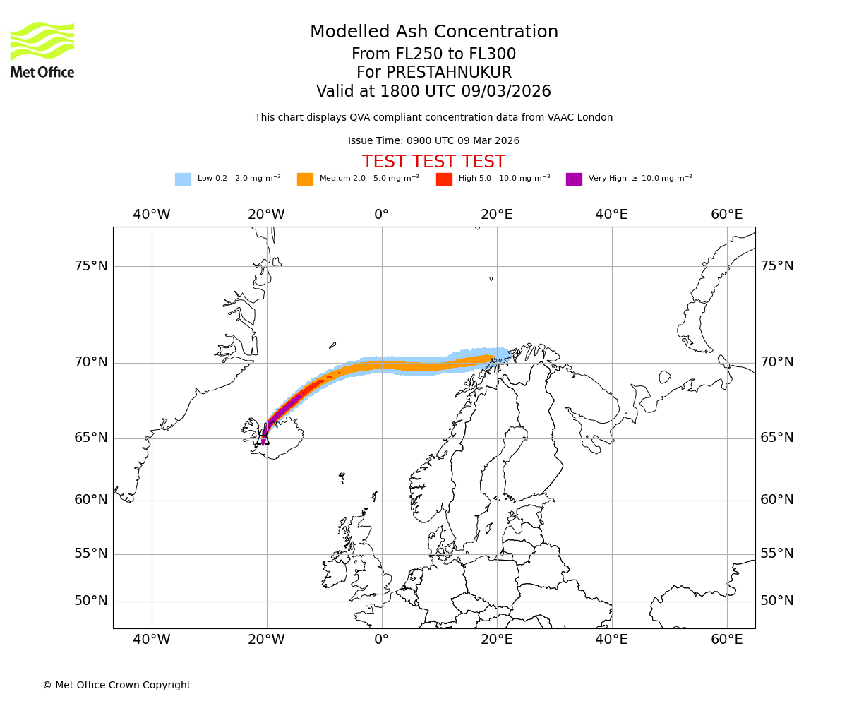 Modelled ash concentration from 250 to 300 for PRESTAHNUKUR. Valid at 1500 UTC 09/03/2026