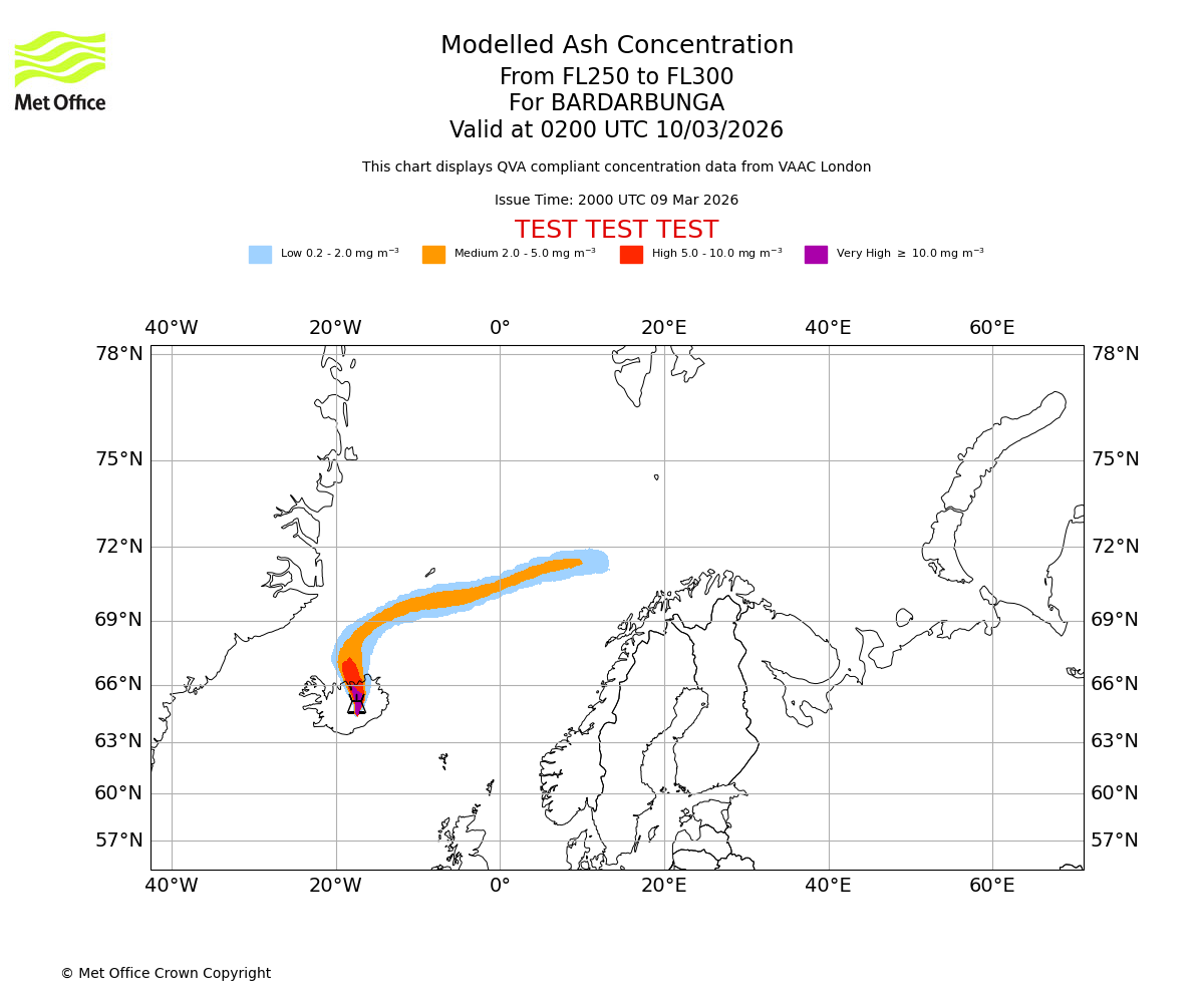 Modelled ash concentration from 250 to 300 for BARDARBUNGA. Valid at 2300 UTC 09/03/2026