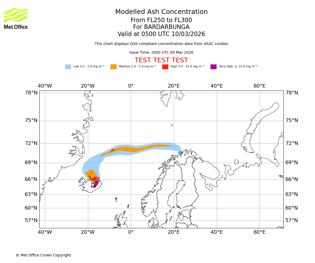 Modelled ash concentration from 250 to 300 for BARDARBUNGA. Valid at 0200 UTC 10/03/2026