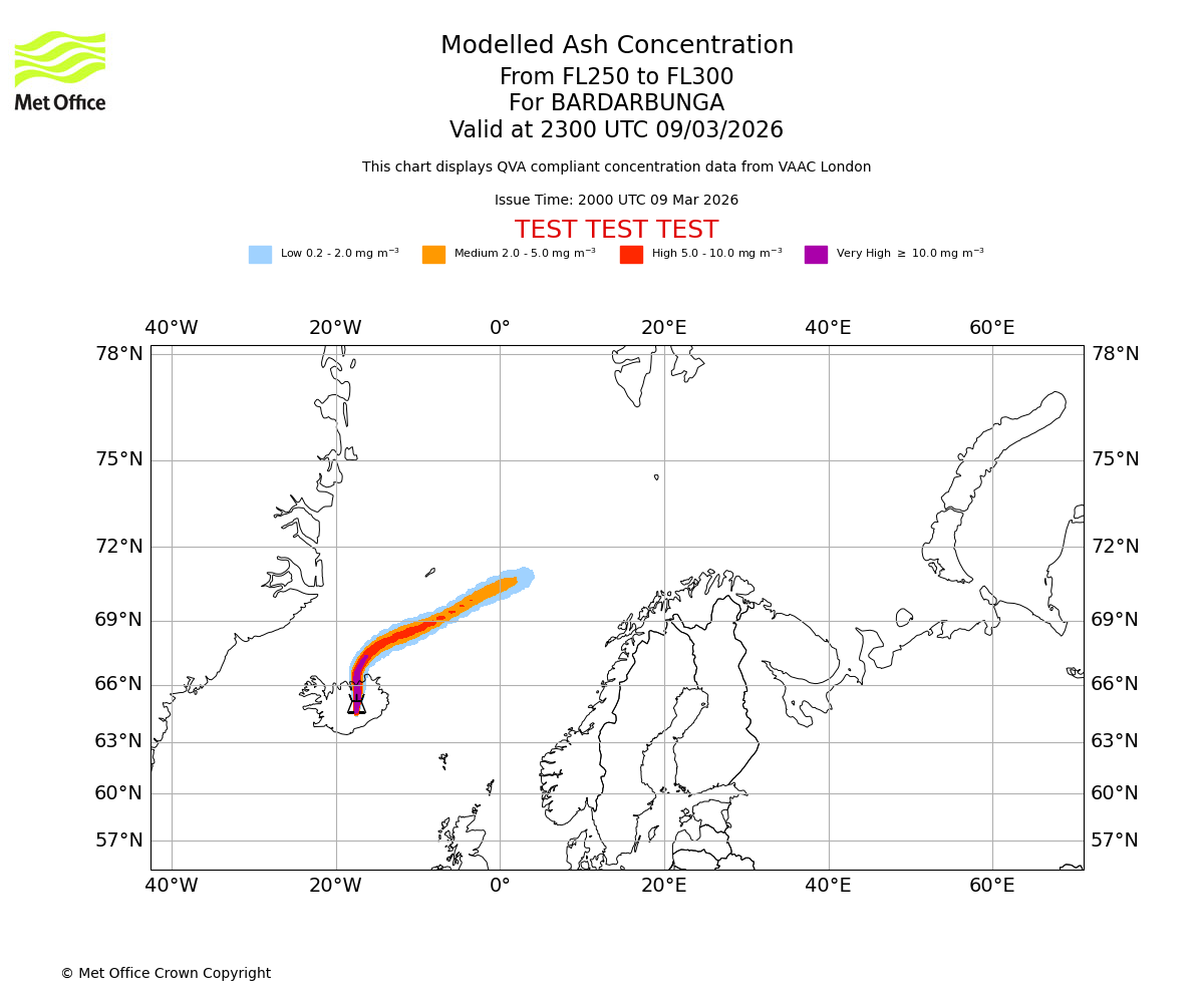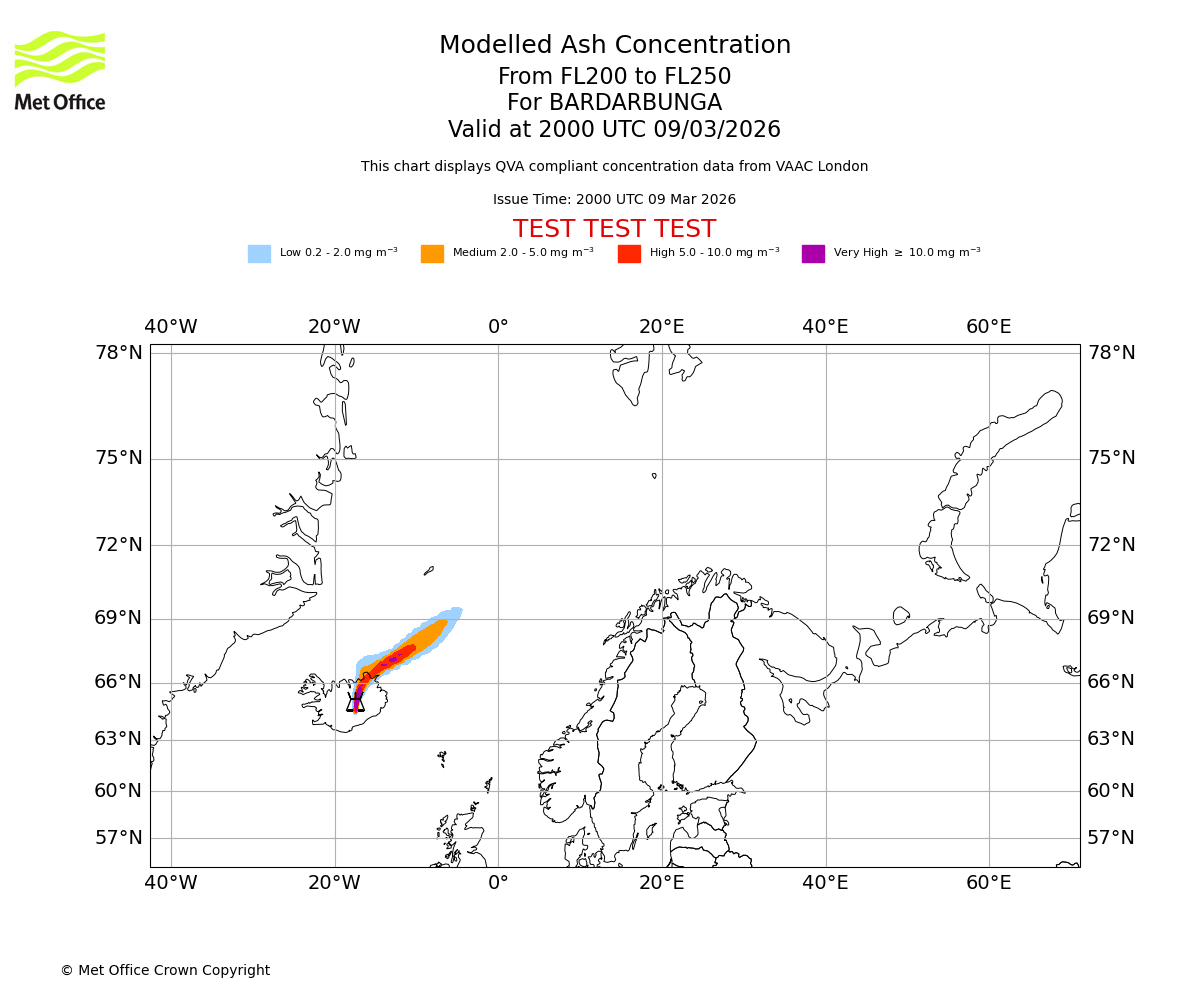 Modelled ash concentration from 250 to 300 for BARDARBUNGA. Valid at 2000 UTC 09/03/2026