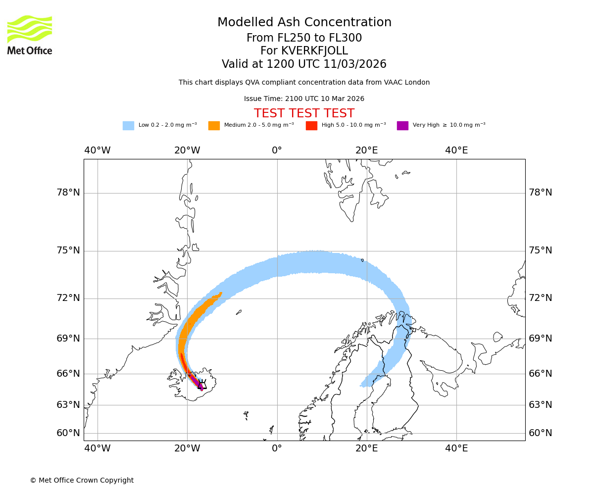 Modelled ash concentration from 250 to 300 for KVERKFJOLL. Valid at 0900 UTC 11/03/2026