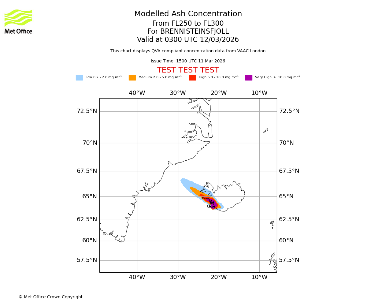 Modelled ash concentration from 250 to 300 for BRENNISTEINSFJOLL. Valid at 0000 UTC 12/03/2026