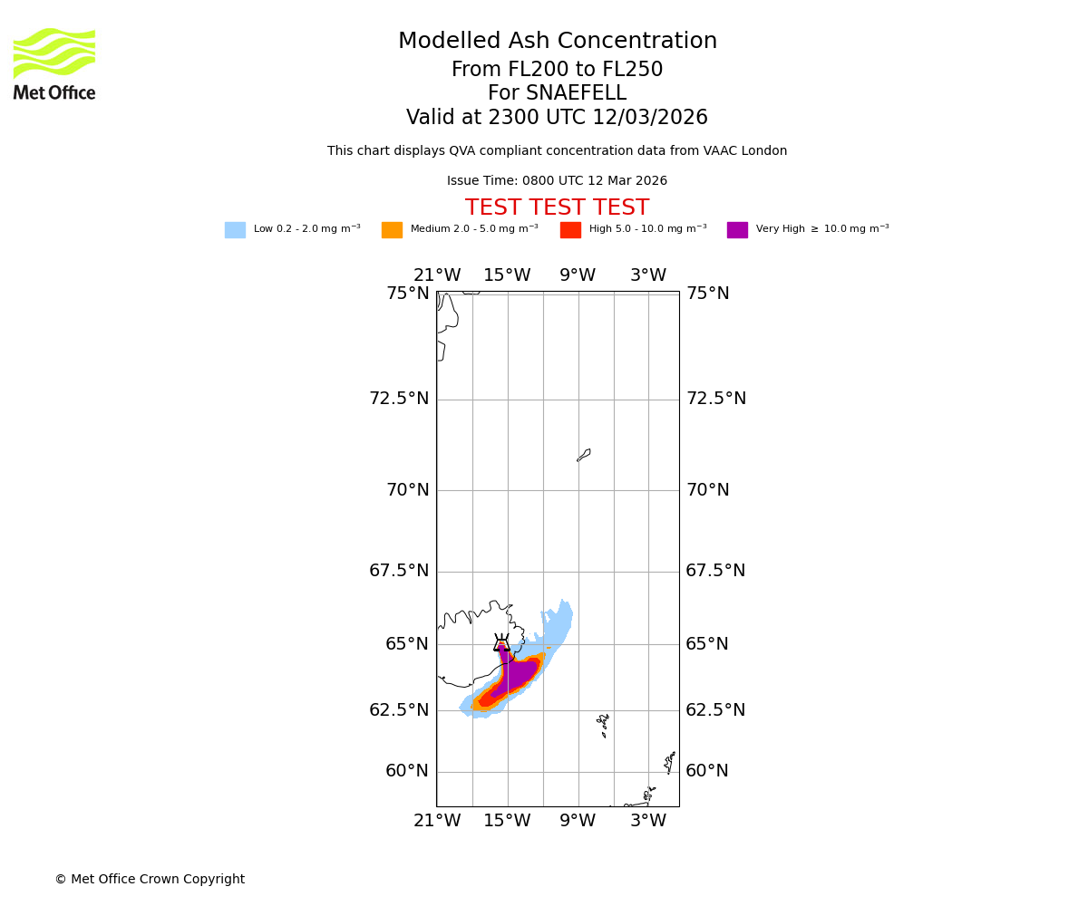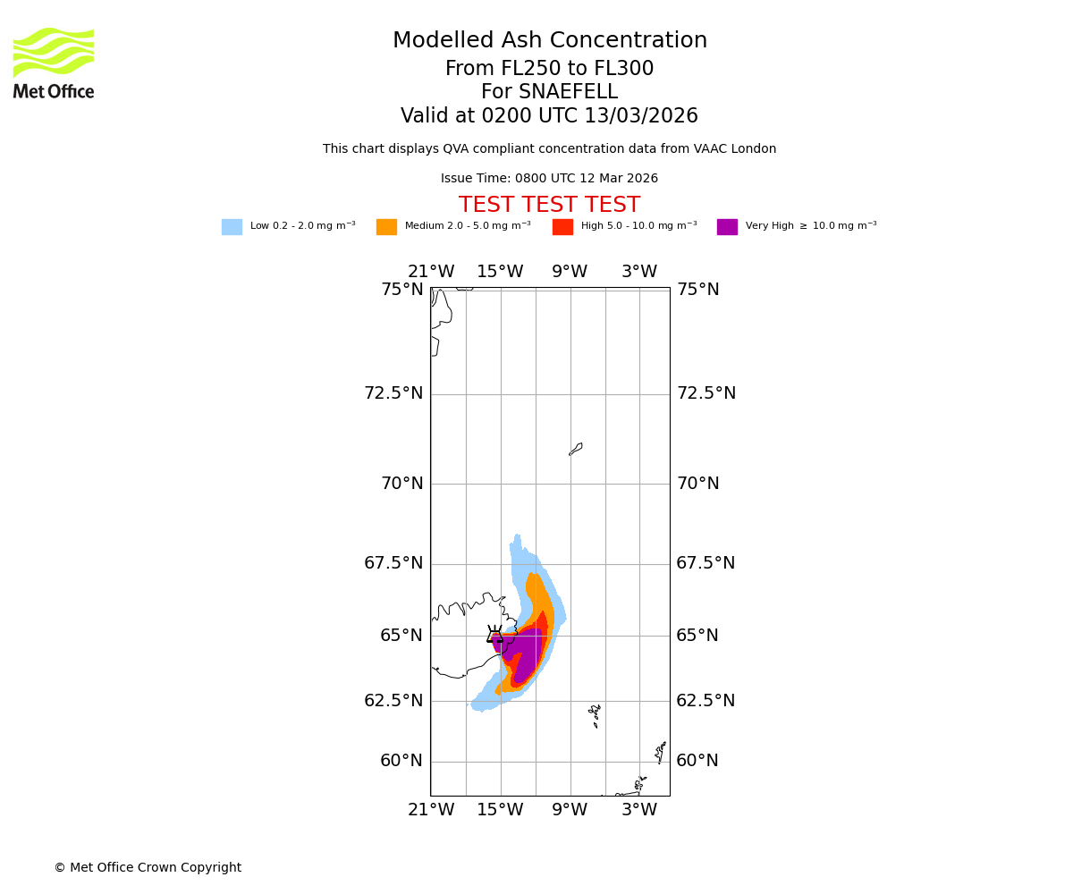Modelled ash concentration from 250 to 300 for SNAEFELL. Valid at 2300 UTC 12/03/2026