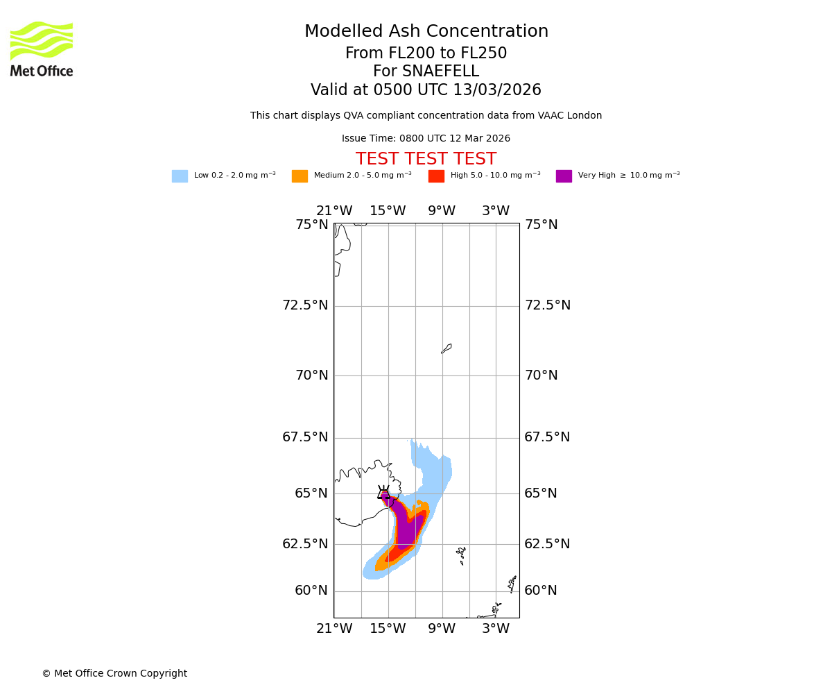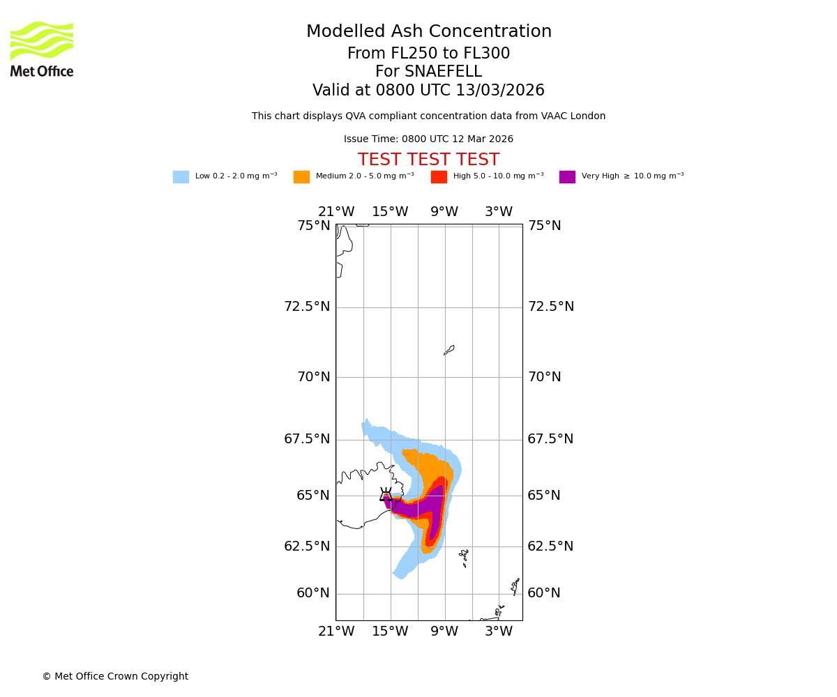 Modelled ash concentration from 250 to 300 for SNAEFELL. Valid at 0500 UTC 13/03/2026