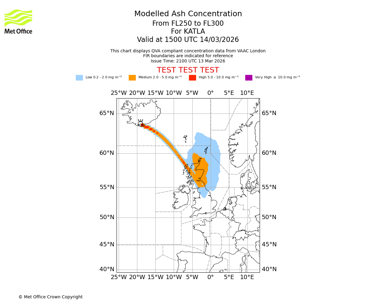 Modelled ash concentration from 250 to 300 for KATLA. Valid at 1200 UTC 14/03/2026