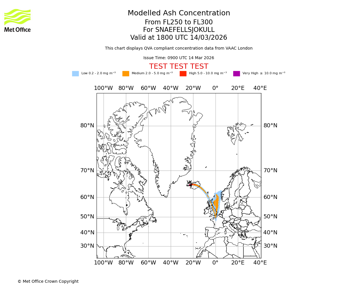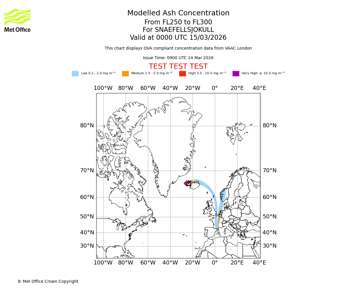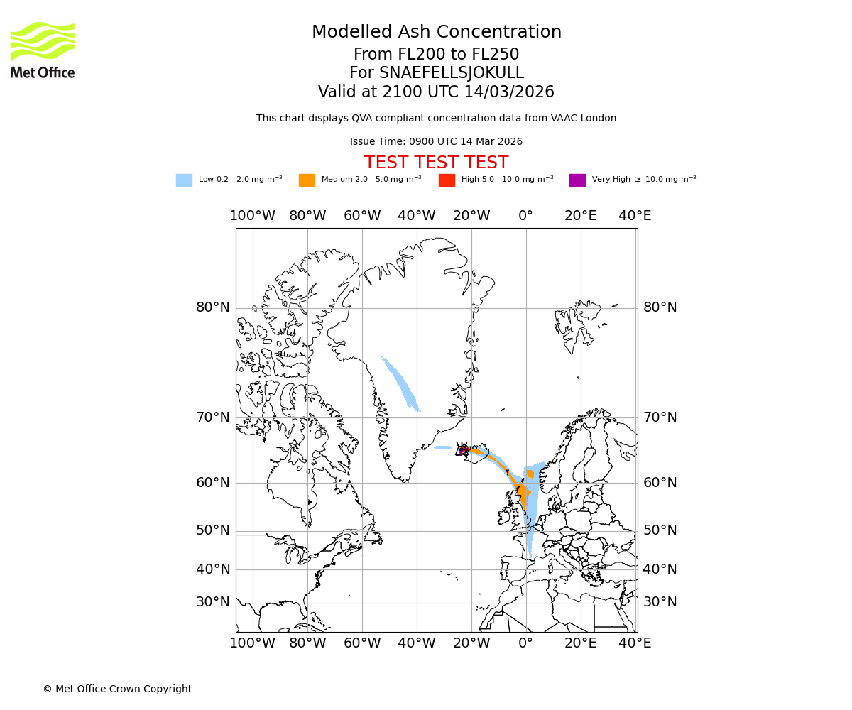 Modelled ash concentration from 250 to 300 for SNAEFELLSJOKULL. Valid at 2100 UTC 14/03/2026