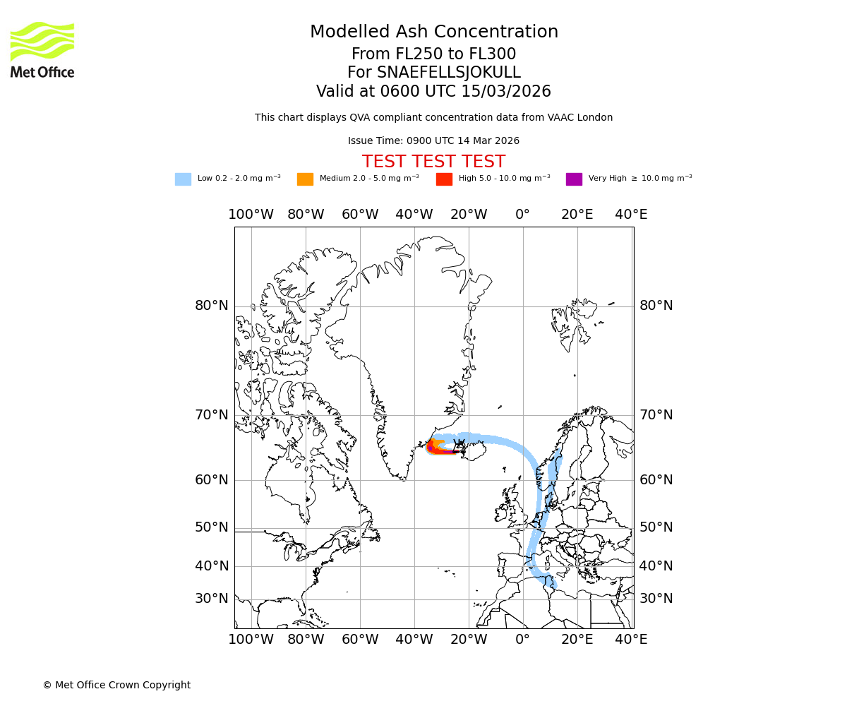 Modelled ash concentration from 250 to 300 for SNAEFELLSJOKULL. Valid at 0300 UTC 15/03/2026