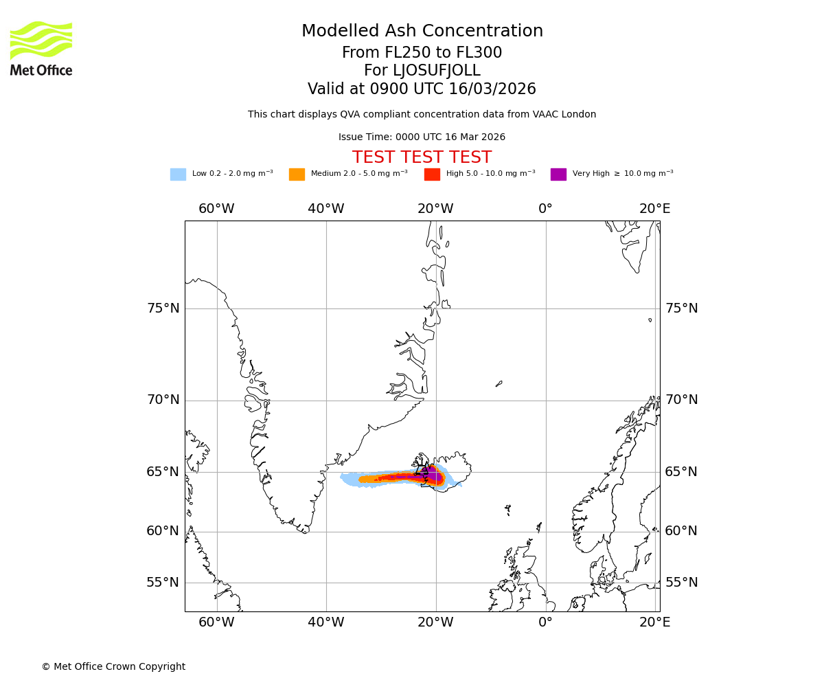 Modelled ash concentration from 250 to 300 for LJOSUFJOLL. Valid at 0600 UTC 16/03/2026