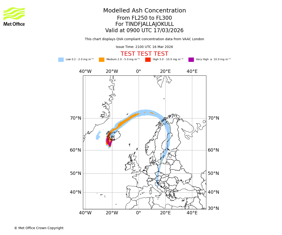 Modelled ash concentration from 250 to 300 for TINDFJALLAJOKULL. Valid at 0600 UTC 17/03/2026