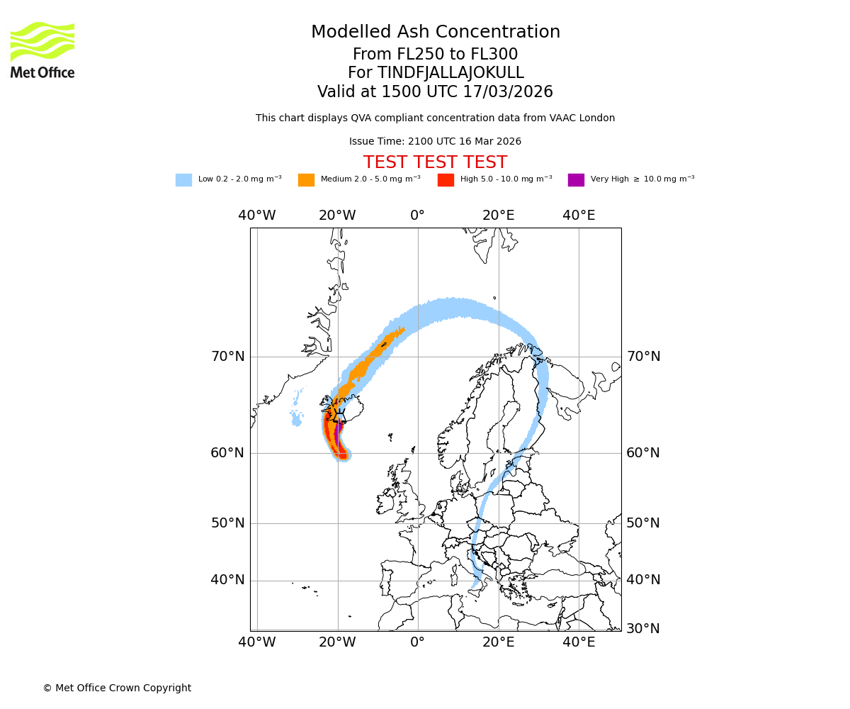 Modelled ash concentration from 000 to 200 for TINDFJALLAJOKULL. Valid at 2100 UTC 16/03/2026
