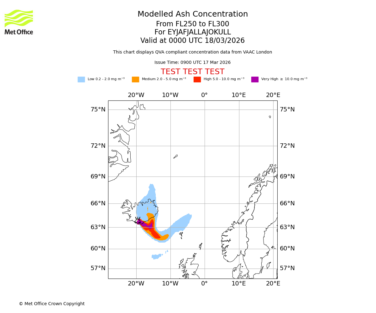 Modelled ash concentration from 250 to 300 for EYJAFJALLAJOKULL. Valid at 2100 UTC 17/03/2026