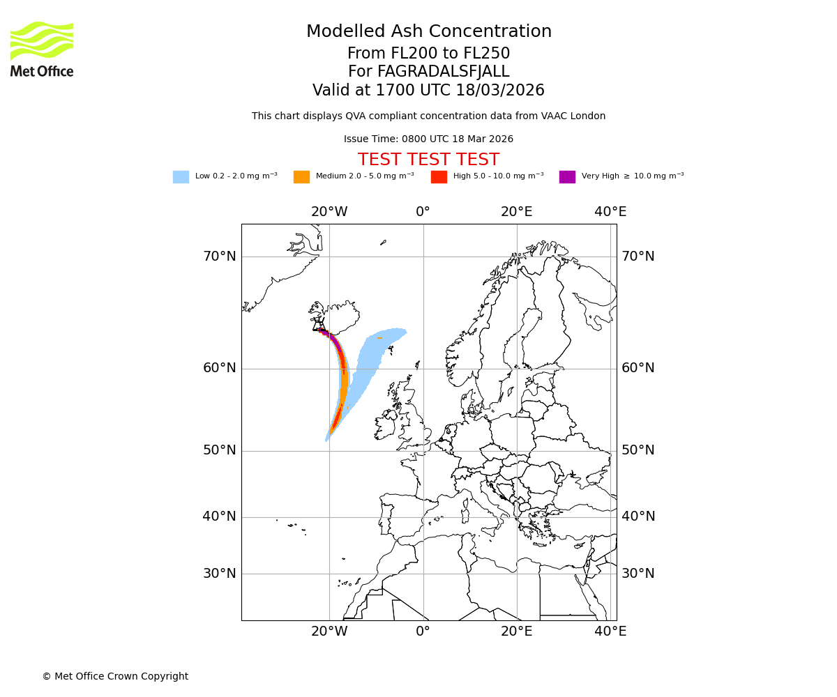 Modelled ash concentration from 000 to 200 for FAGRADALSFJALL. Valid at 0800 UTC 18/03/2026