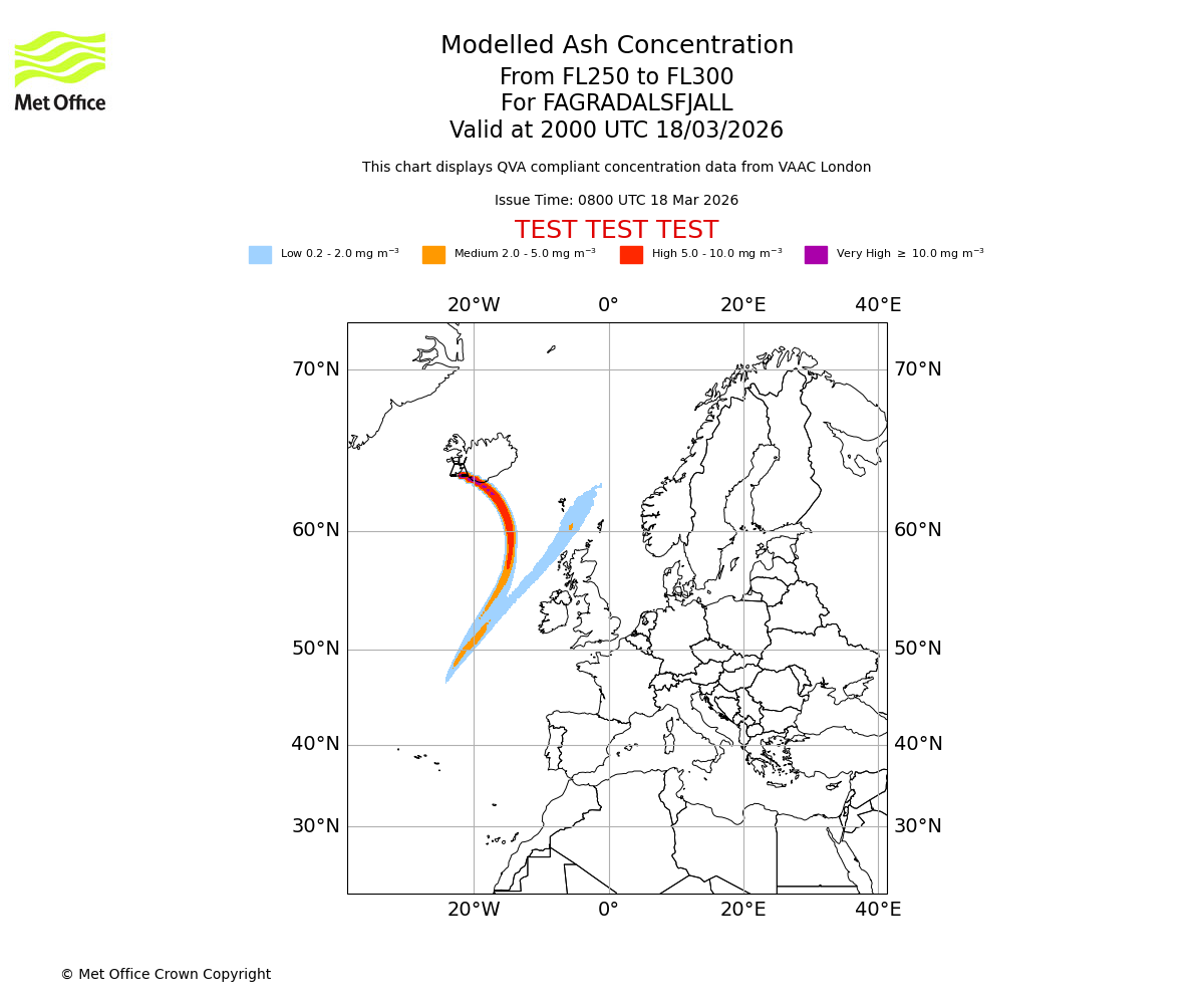 Modelled ash concentration from 250 to 300 for FAGRADALSFJALL. Valid at 1700 UTC 18/03/2026