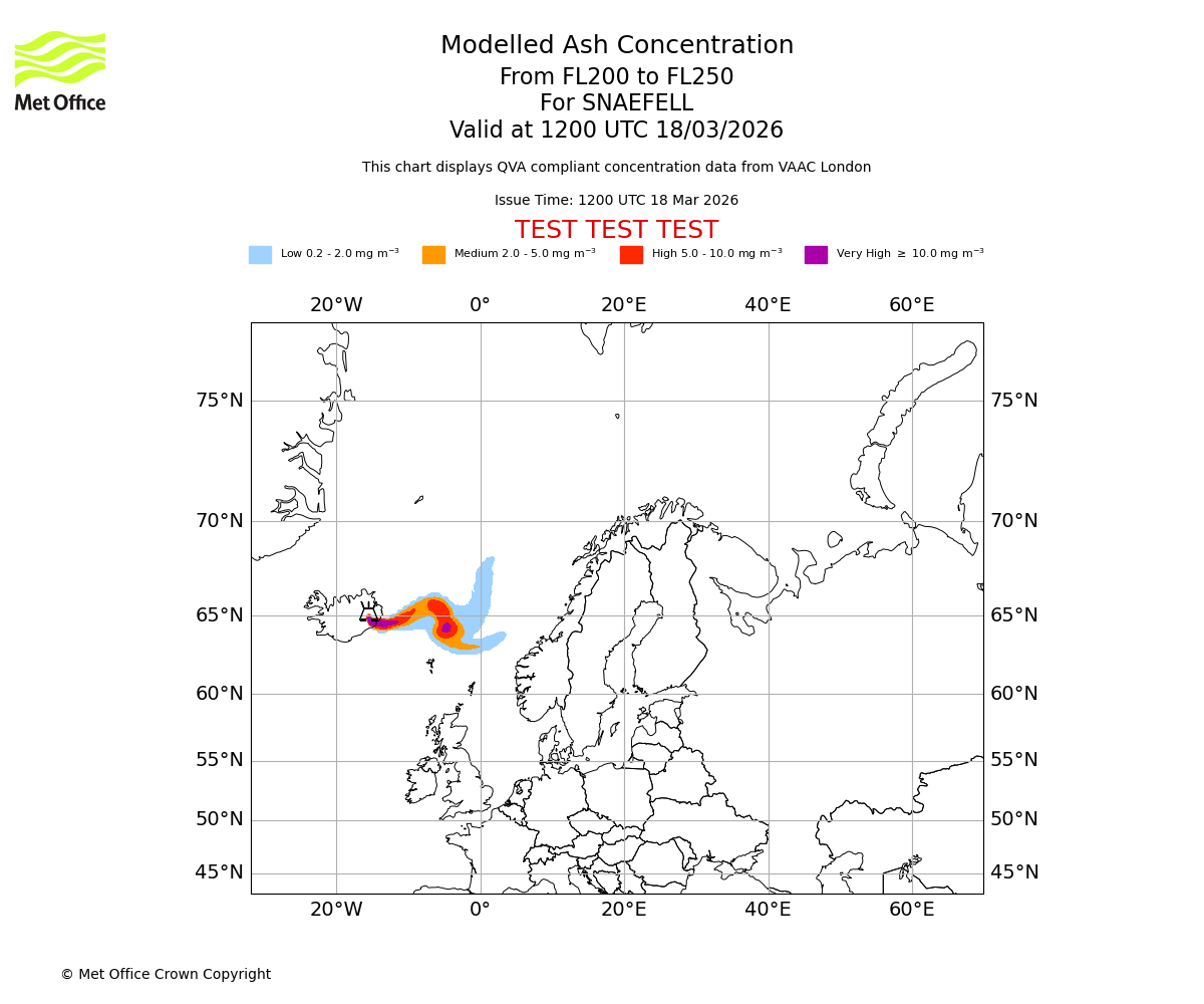 Modelled ash concentration from 000 to 200 for SNAEFELL. Valid at 1200 UTC 18/03/2026