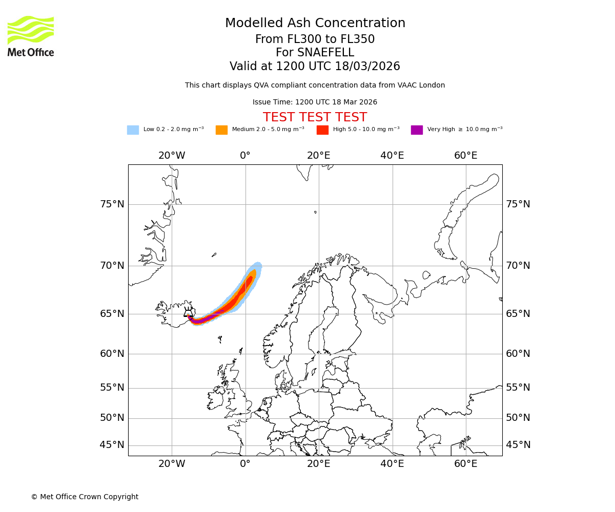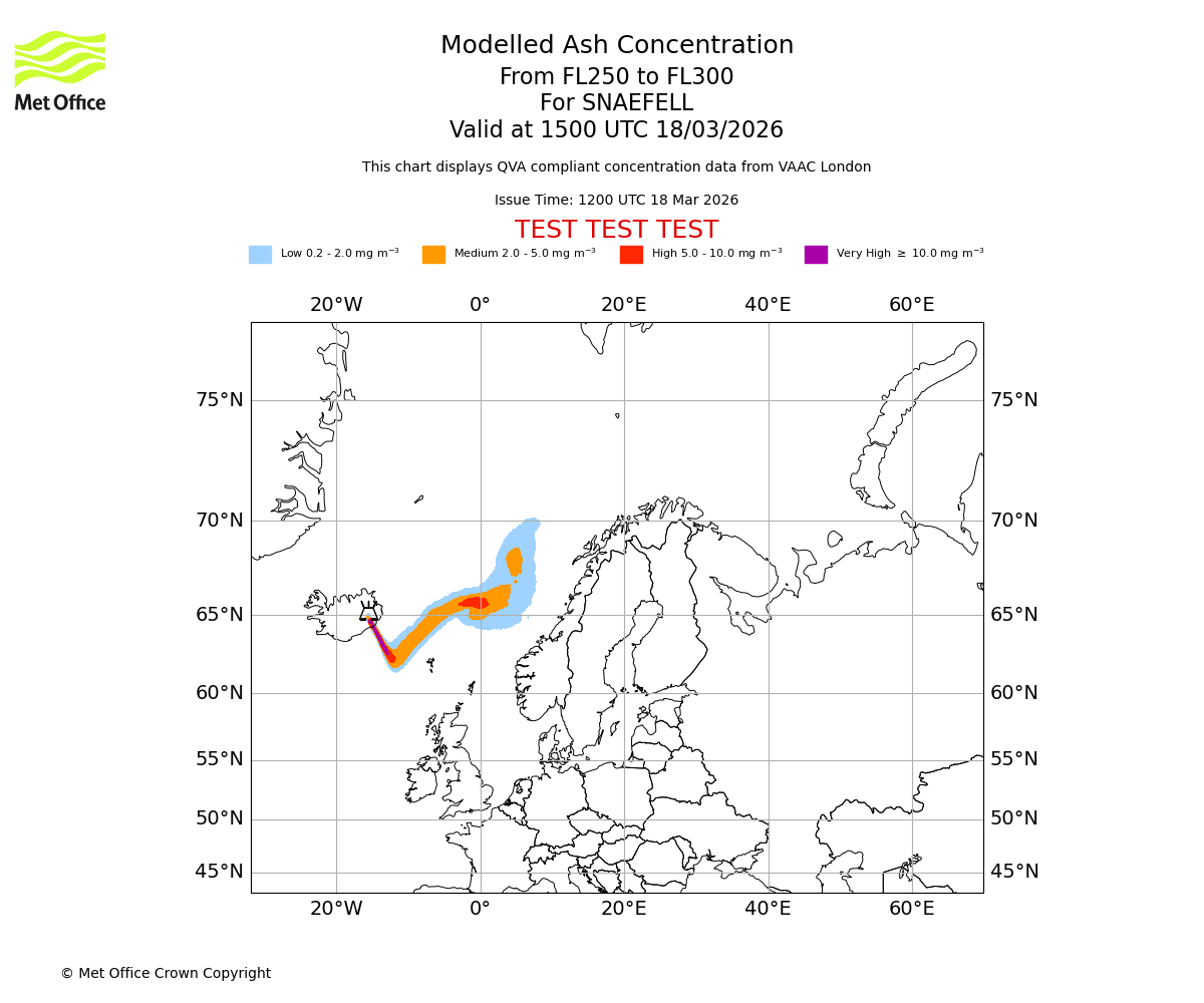 Modelled ash concentration from 250 to 300 for SNAEFELL. Valid at 1200 UTC 18/03/2026