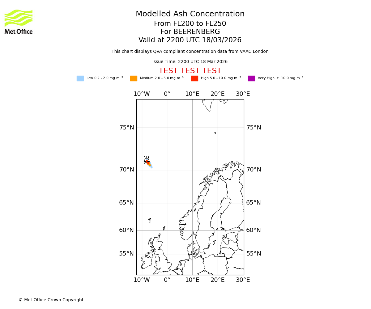 Modelled ash concentration from 000 to 200 for BEERENBERG. Valid at 2200 UTC 18/03/2026