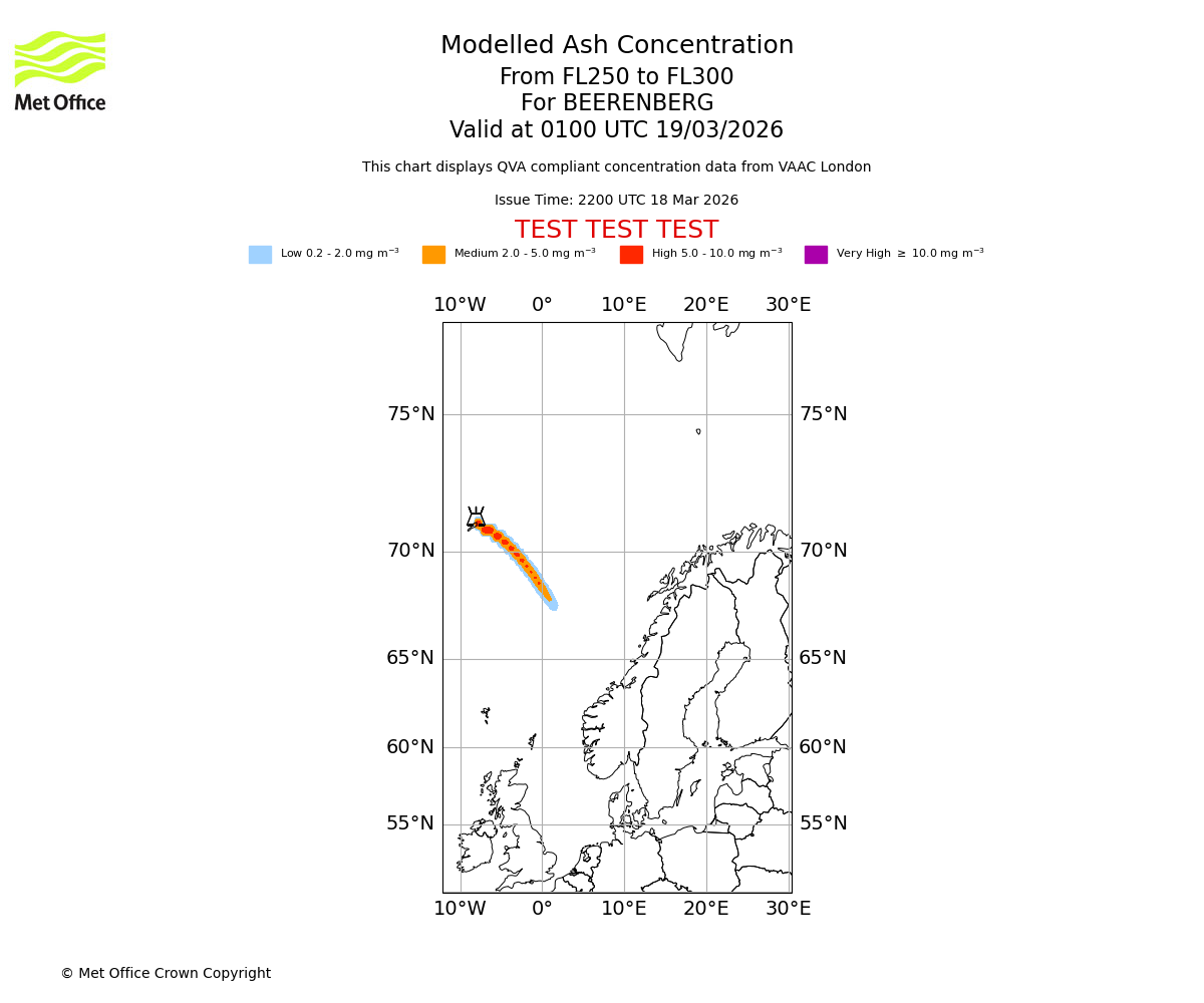 Modelled ash concentration from 250 to 300 for BEERENBERG. Valid at 2200 UTC 18/03/2026
