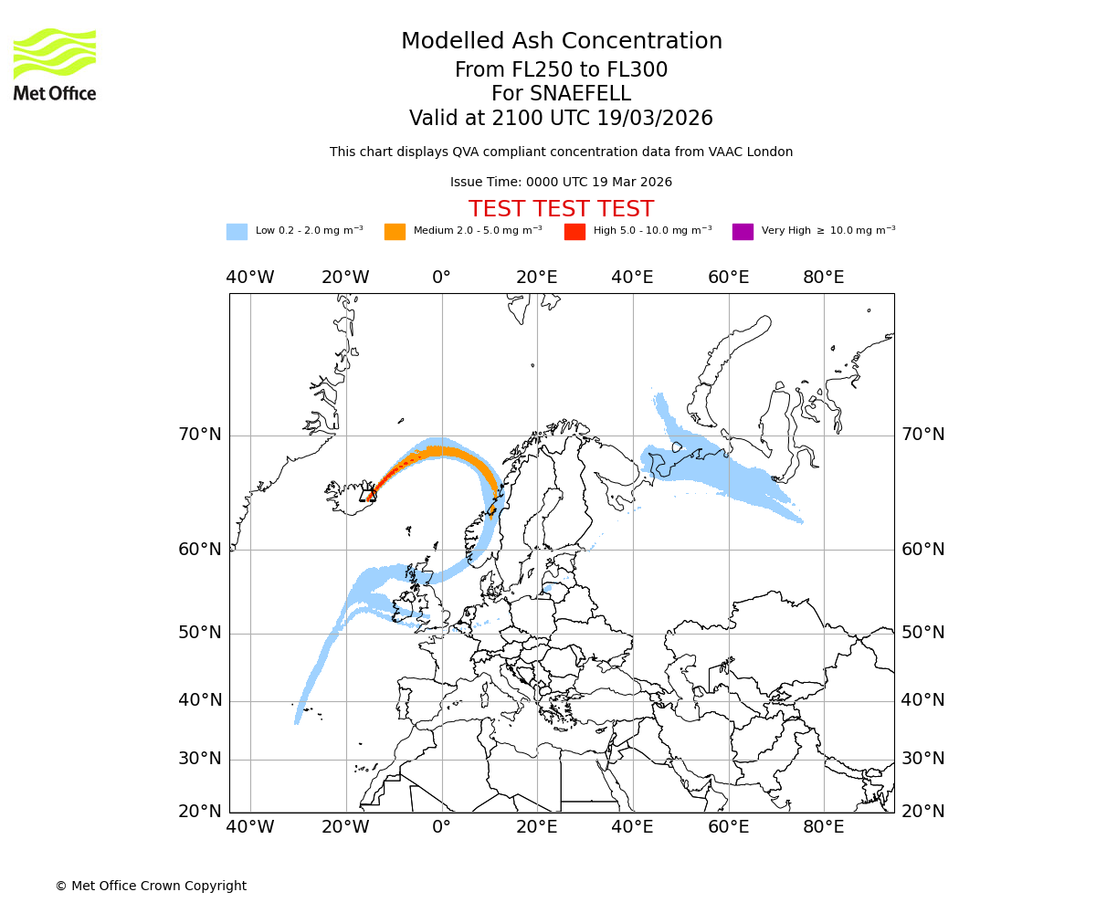Modelled ash concentration from 250 to 300 for SNAEFELL. Valid at 1800 UTC 19/03/2026
