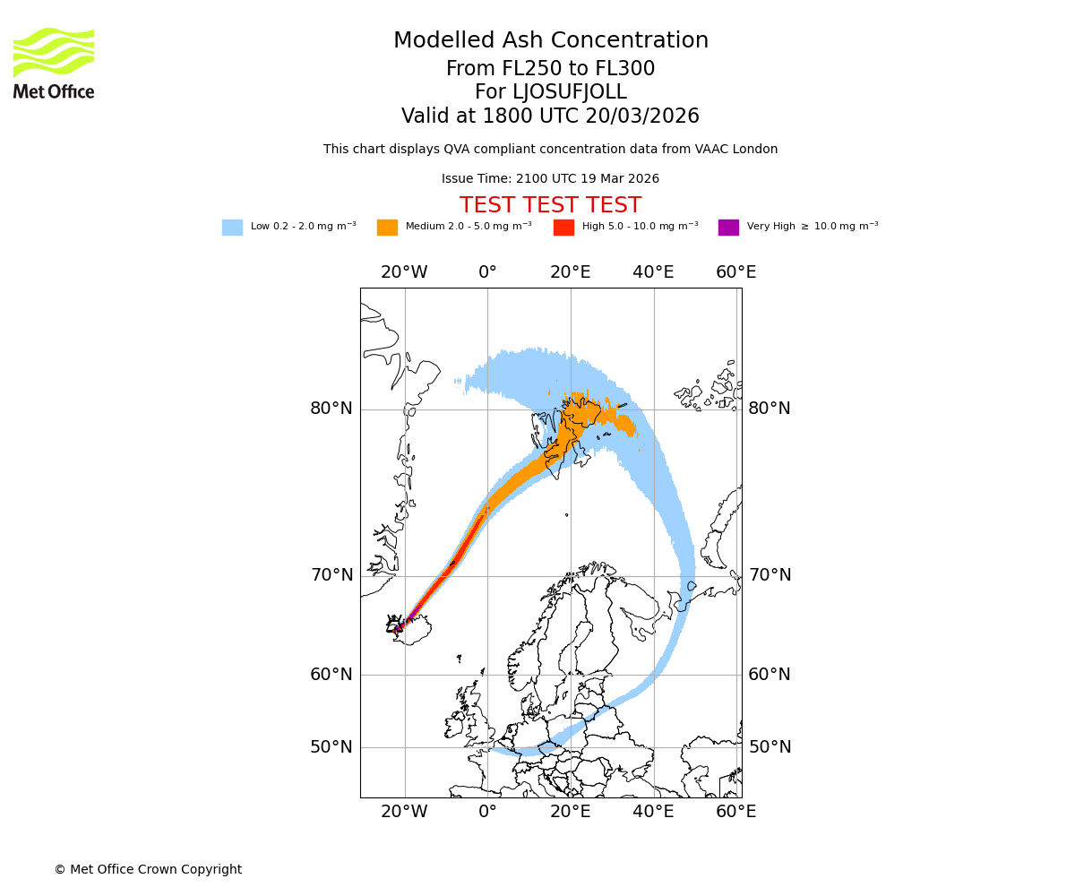 Modelled ash concentration from 250 to 300 for LJOSUFJOLL. Valid at 1500 UTC 20/03/2026