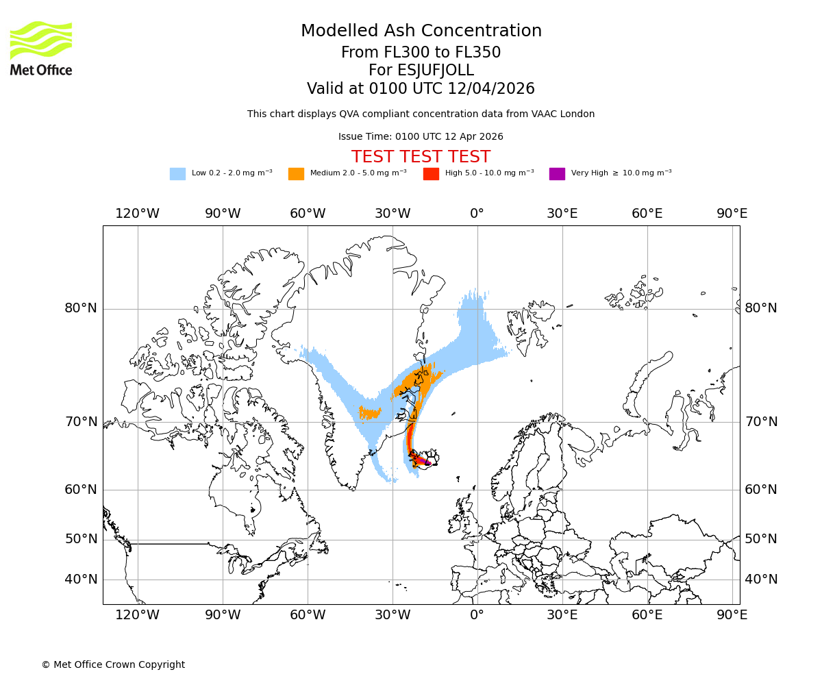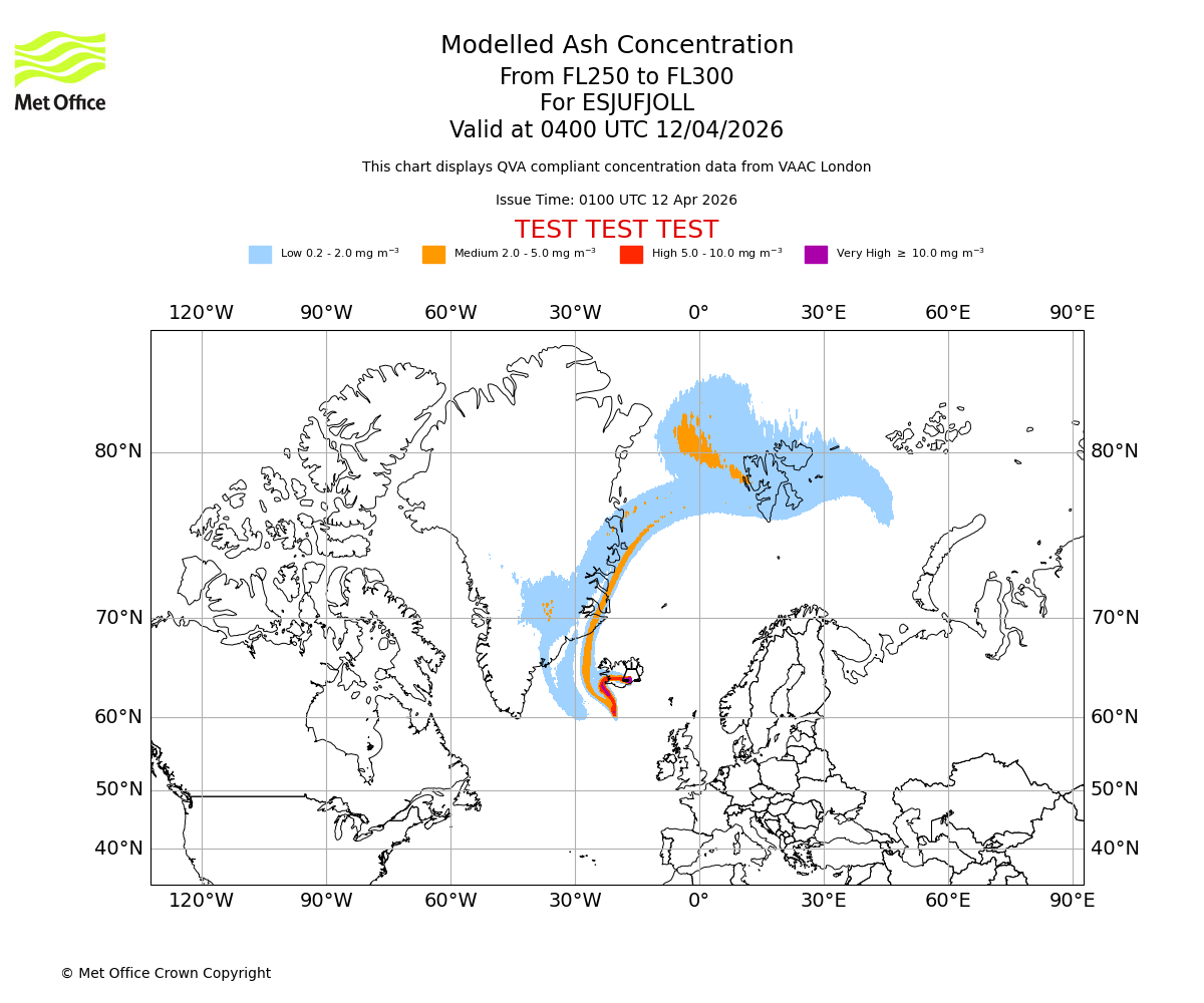 Modelled ash concentration from 250 to 300 for ESJUFJOLL. Valid at 0100 UTC 12/04/2026