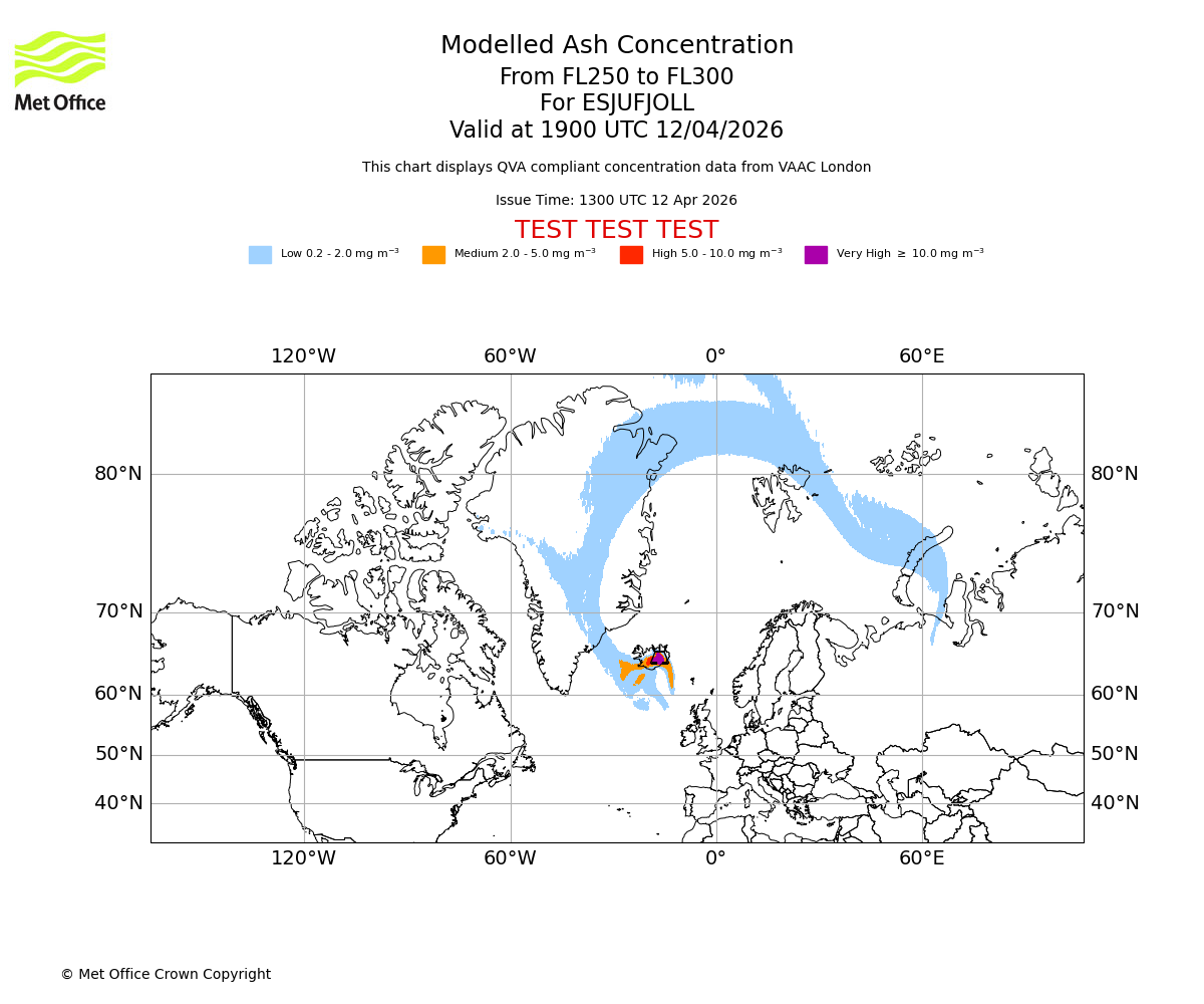 Modelled ash concentration from 250 to 300 for ESJUFJOLL. Valid at 1600 UTC 12/04/2026
